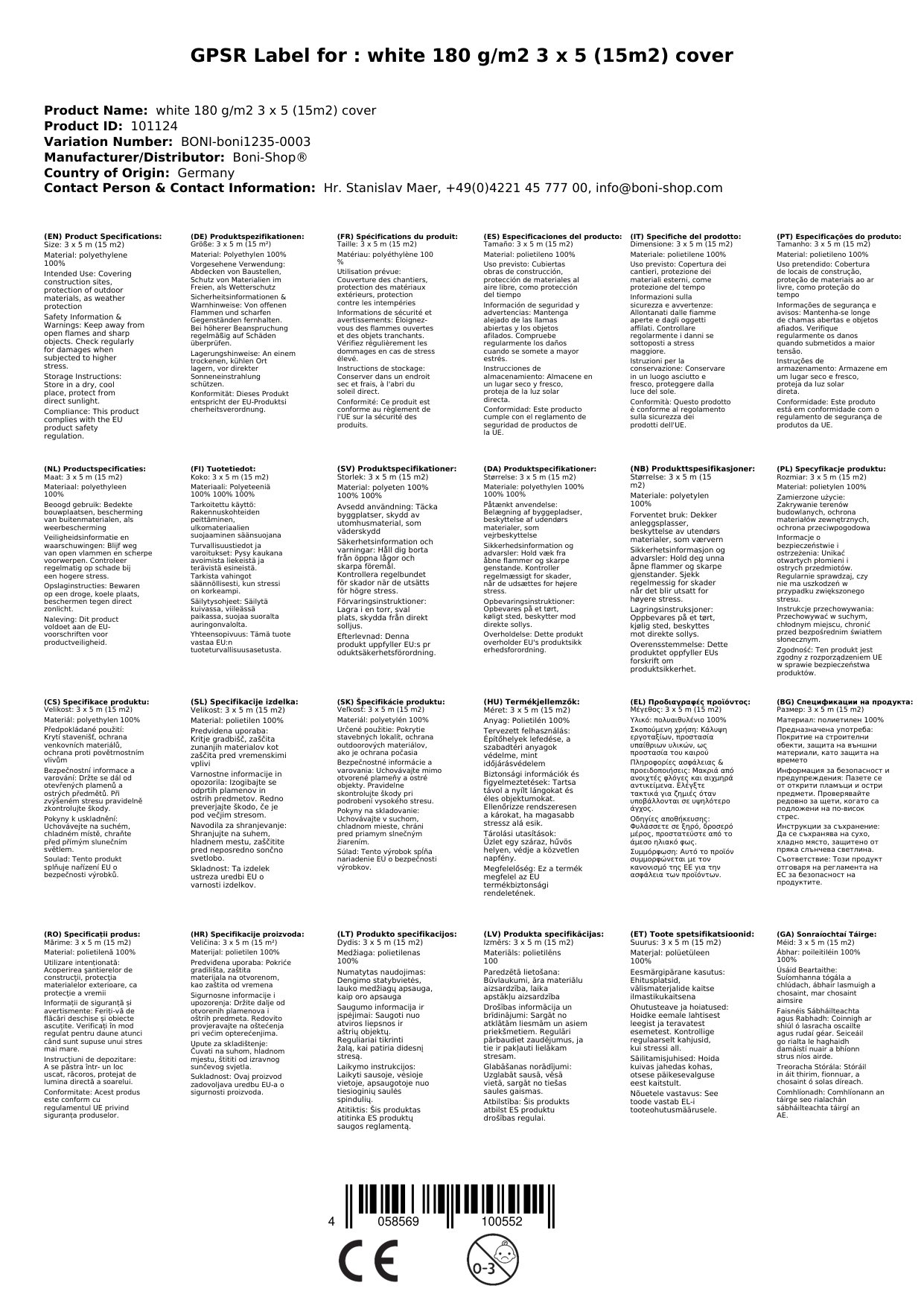 Clúdach Cosanta 3x5m, Bán, 180g/m², Uiscedhíonach, frith-UV