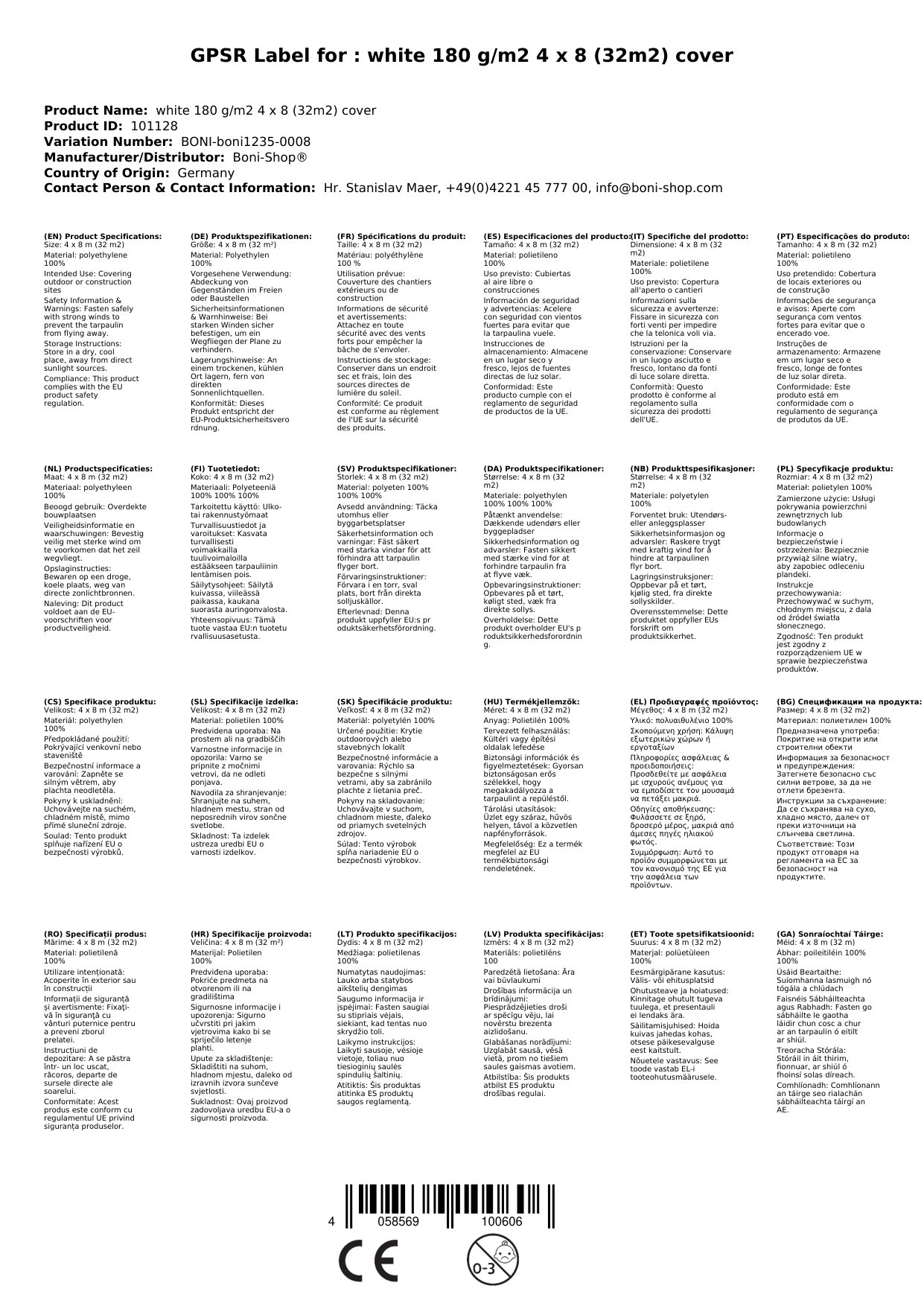 Clúdach Tarpaulin 4x8m, 32m², Bán, 180 g/m², Uiscedhíonach, Frithsheasmhach in aghaidh Cuimilt