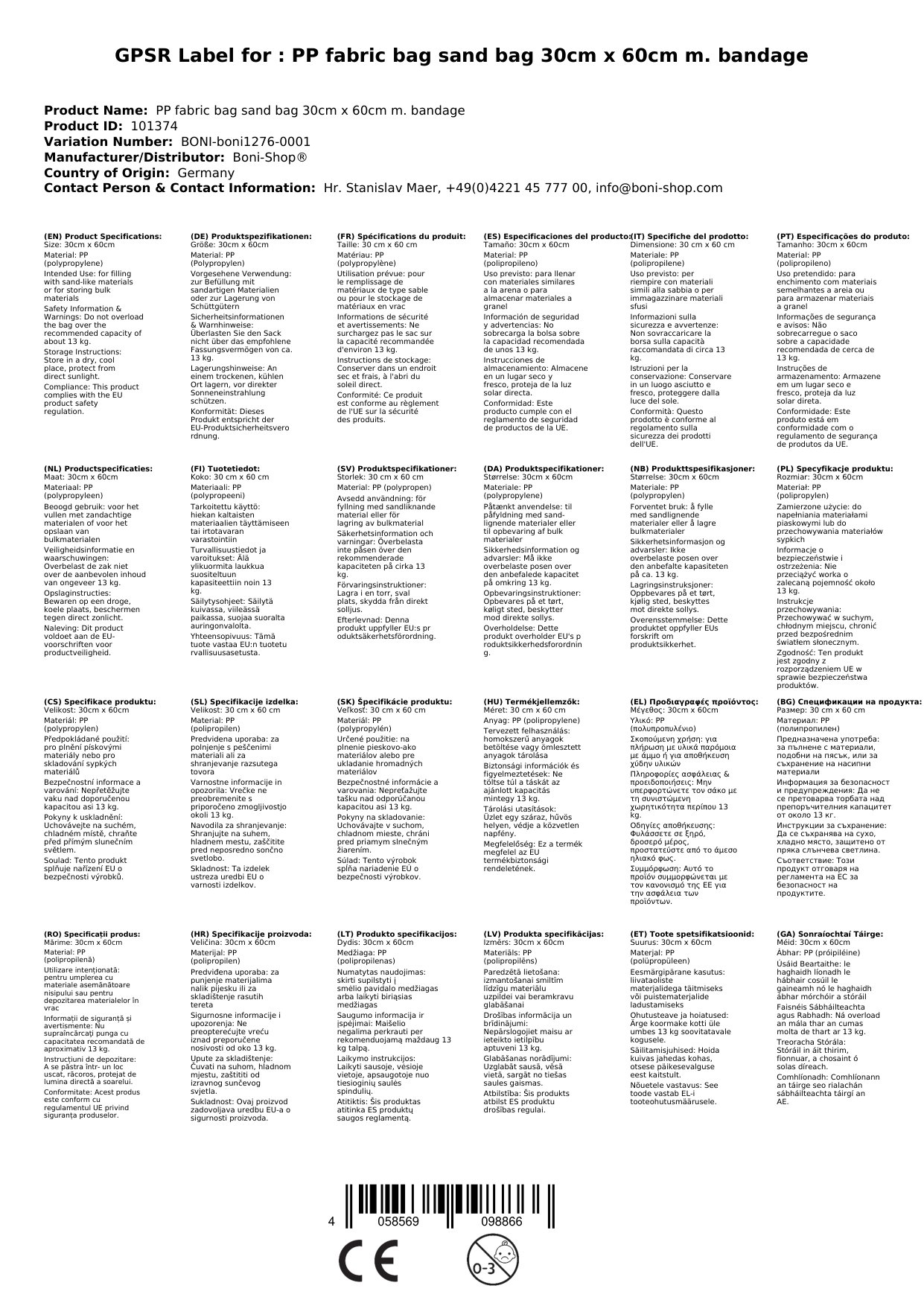 Mála Gainimh, Sac PP 30x60cm, Sac Tromshaothair le Cosaint UV