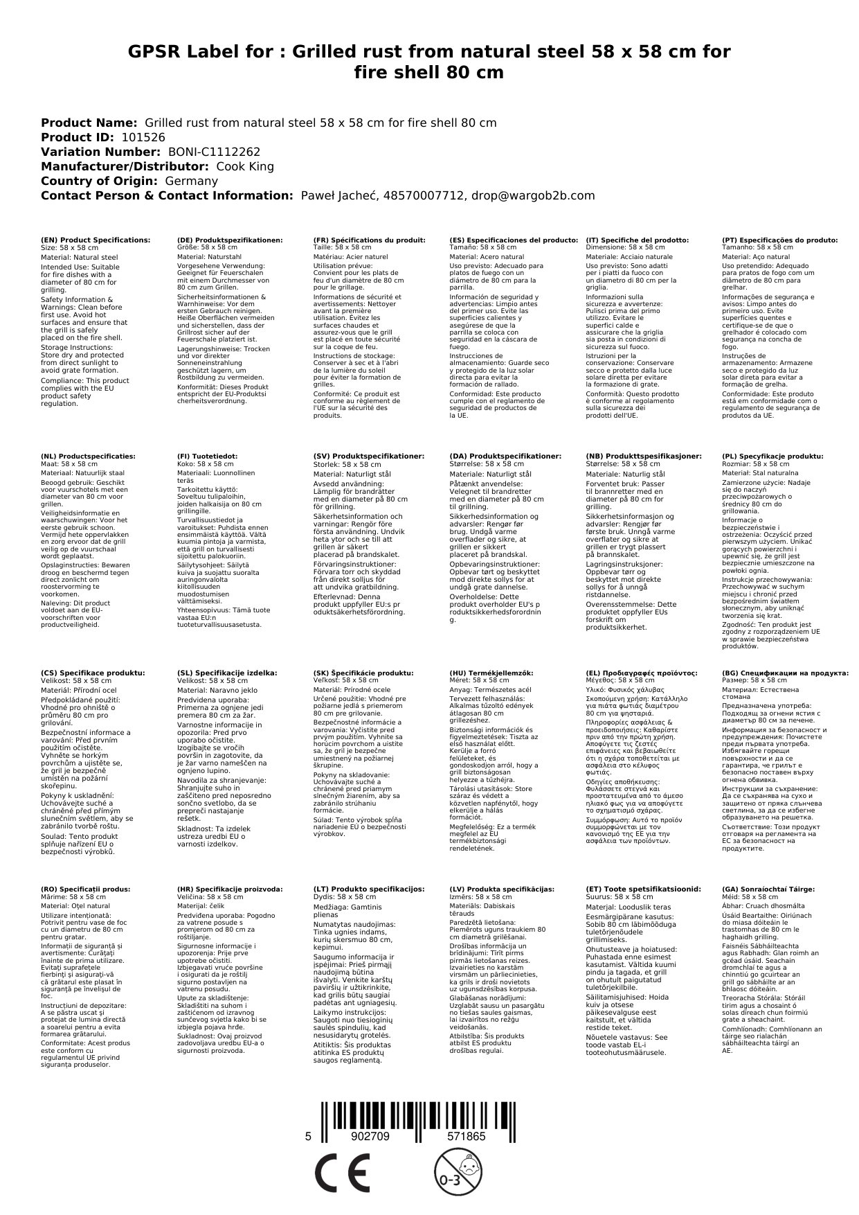 An bhfuil gríl láidir agus buan á lorg agat do do thine chnámh? Tá an gríl seo déanta as cruach nádúrtha, 58 x 58 cm, agus tá sé oiriúnach do thinnte cnámh le trastomhas 80 cm. Soláthraíonn sé dromchla mór gríleála agus tá sé éasca a iompar a bhuíochas leis na láimhseálacha saincheaptha. Leis an gríl seo, is féidir leat do thine chnámh a úsáid go barrmhaith le haghaidh gríleála agus taitneamh a bhaint as tráthnóntaí dodhearmadta amuigh faoin aer.