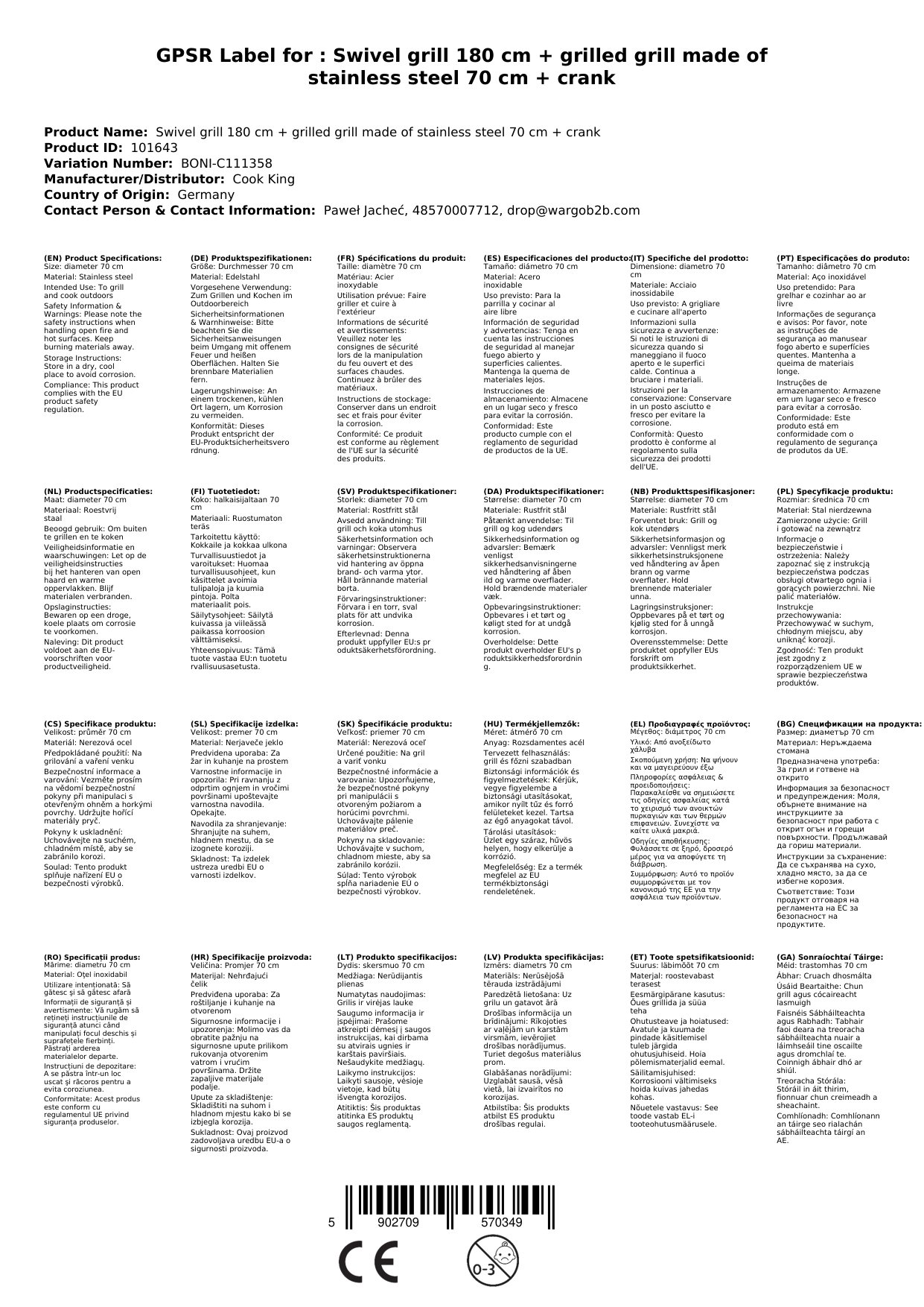 - Gríl Cruach Dhosmálta Ardchaighdeáin: Tá an gríl ollmhór le trastomhas 70 cm déanta as cruach dhosmálta, creimeadh-resistant agus cuireann sé ar chumas grilling miasa a ullmhú do go leor aíonna. Tá tiús 4 mm sna barraí.