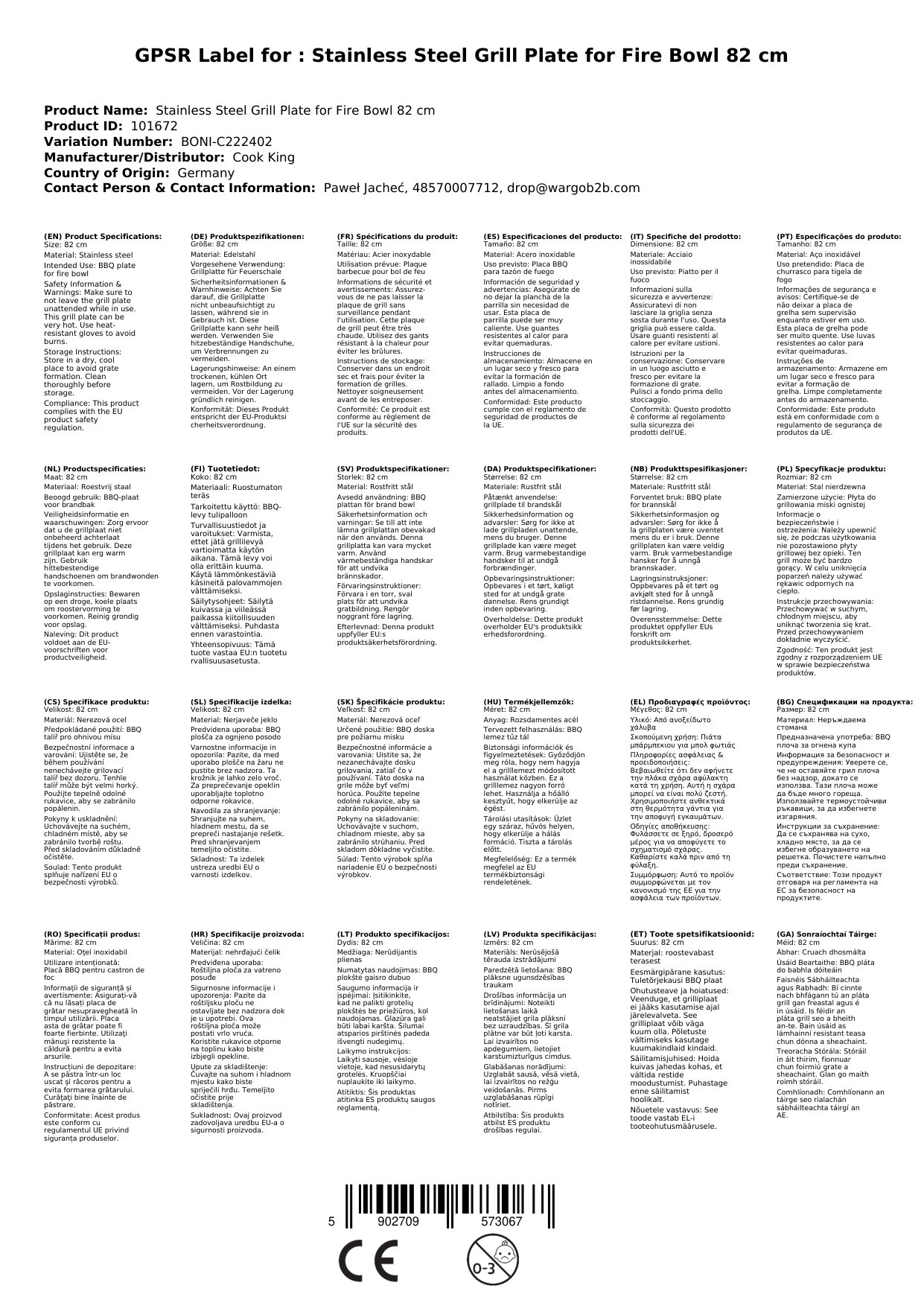 - Cáilíocht den scoth: Déantar an pláta grill a mhonarú san Eoraip agus comhlíonann sé na caighdeáin is airde.