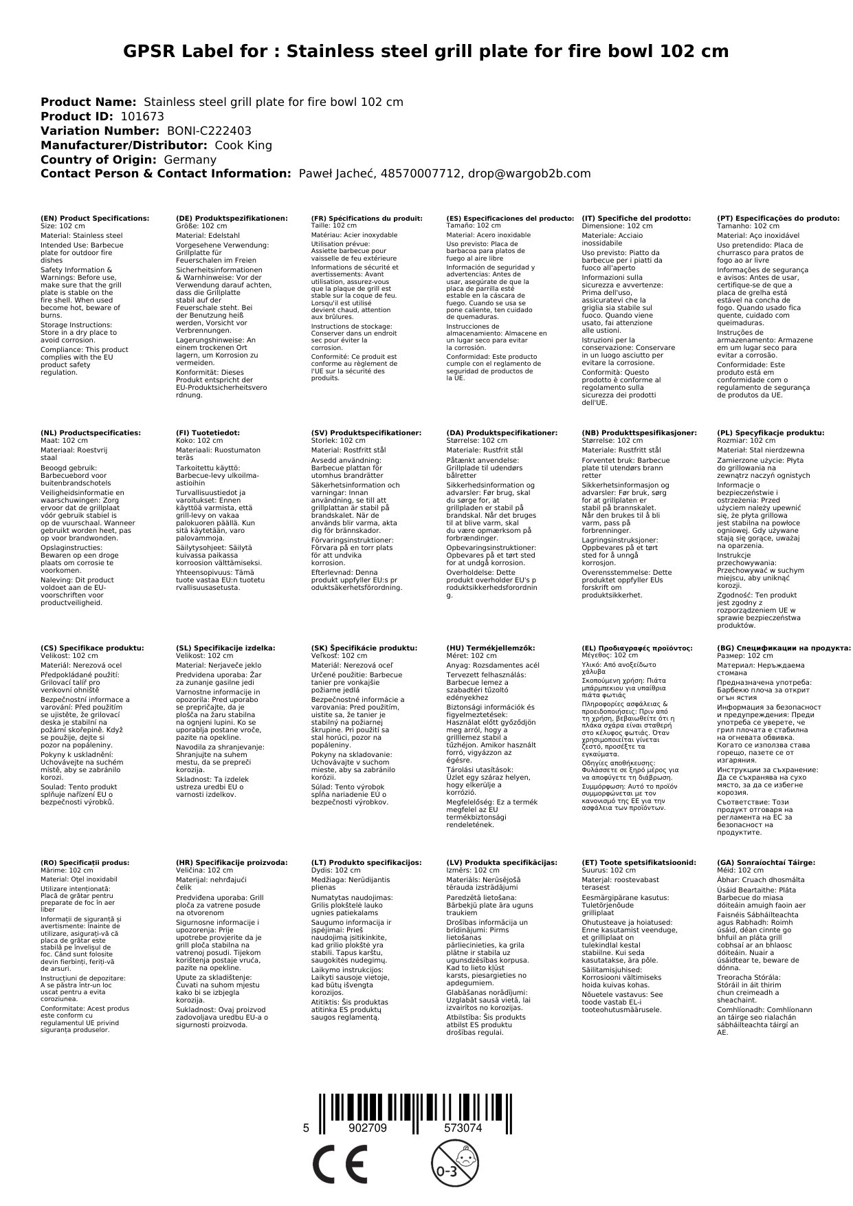 Tá an pláta grill deartha le haghaidh tiní cnámh le trastomhas 102 cm. Oireann sé do na samhlacha BALI, DUBAI, POLO, PORTO, VIKING, INDIANA, SANTIAGO, PANAMA.