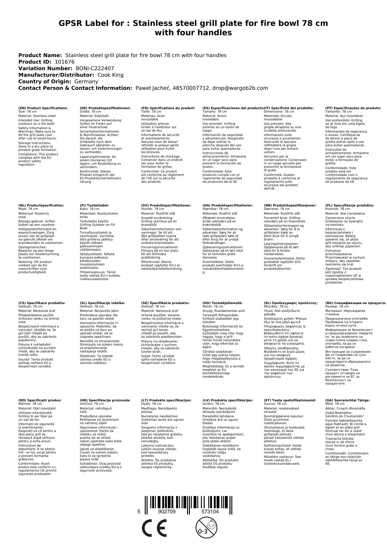 Soláthraíonn ár pláta grill cruach dhosmálta an bonn idéalach duit le haghaidh grilling suaimhneach os cionn an tine oscailte. Le trastomhas 78 cm, cuireann sé go leor spáis ar fáil do do bhia grilling. Ciallaíonn na ceithre láimhseáil phraiticiúla go bhfuil sé éasca é a láimhseáil agus a chur go sábháilte ar an fheobrais. Ráthaíonn airíonna dosmálta an chruach dhosmálta saolré fada agus glanadh éasca. Is féidir leat brath ar phláta grill ardcháilíochta a shaibhríonn d'eispéireas grilling.