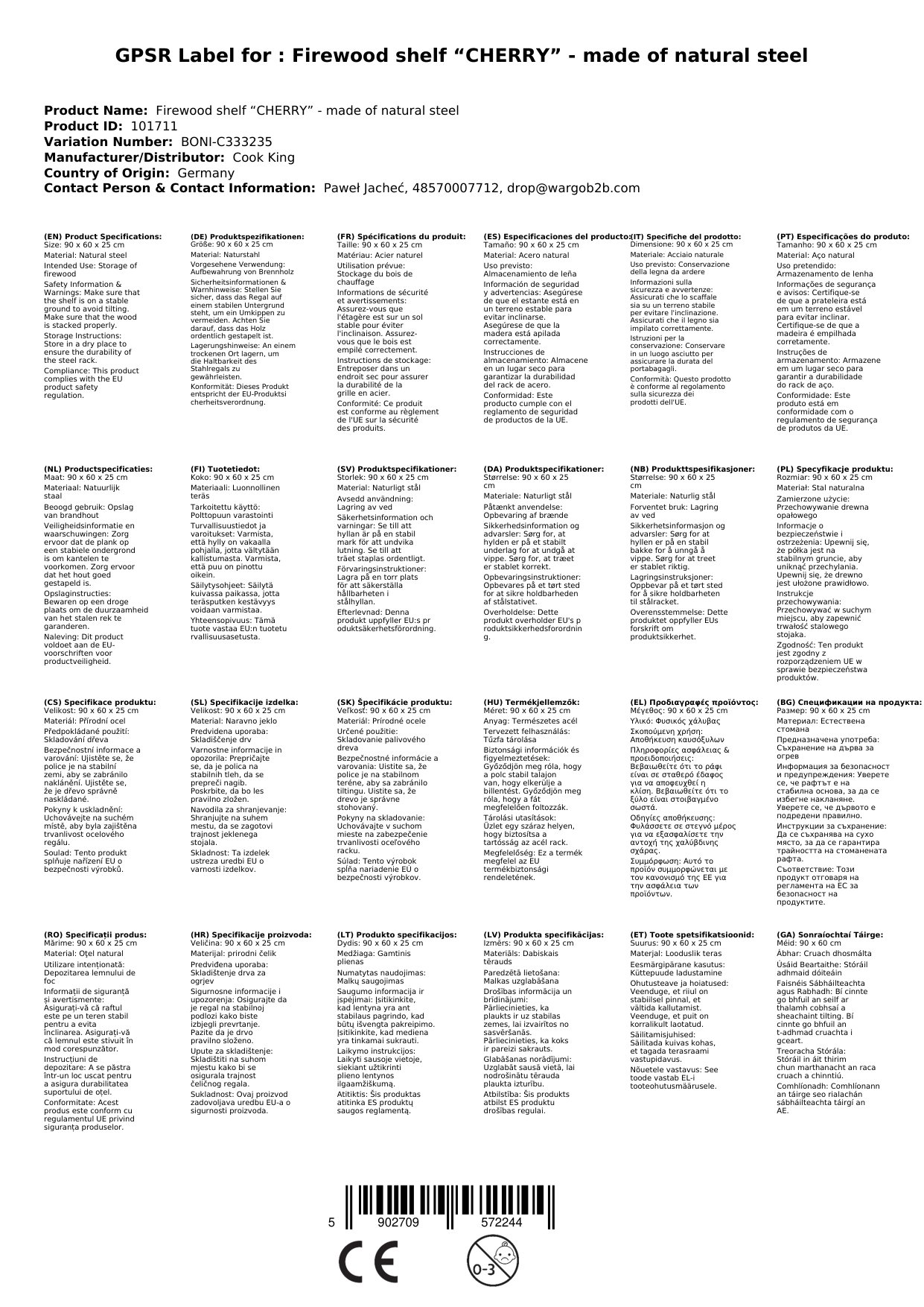Cuireann an Seilf Adhmaid Tine CHERRY réiteach praiticiúil agus stylish ar fáil do stóráil adhmaid tine. Le toisí 90 x 60 x 25 cm, feileann sé go hidéalach i dtimpeallachtaí éagsúla. Cinntíonn an tógáil cruach brataithe le púdar aimsirdhíonacht agus marthanacht. Cén fáth go bhfuil sé seo tábhachtach duit: Faigheann tú seilf láidir agus fada buan a chosnaíonn d'adhmad tine go barrmhaith agus a chuireann le do theach freisin.