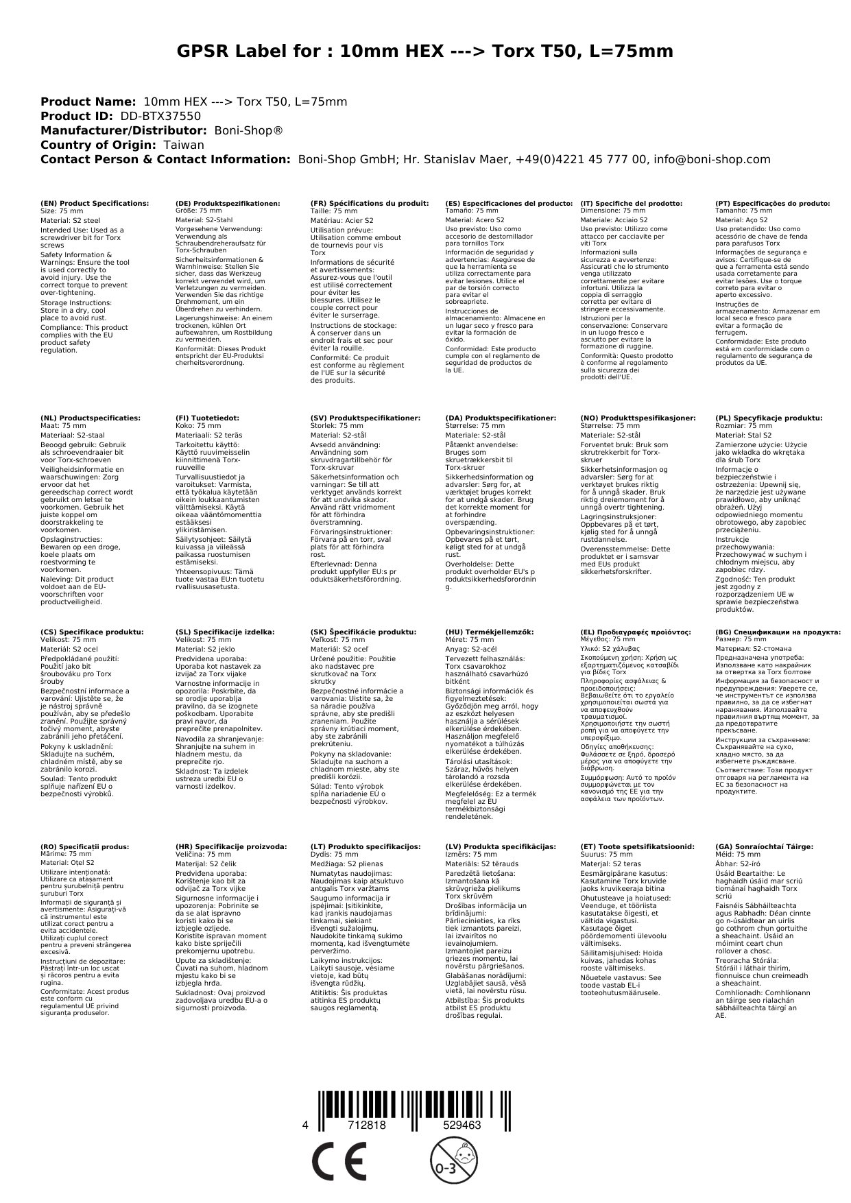 | Uimhir earra | BONI-DD-BTX37550 |