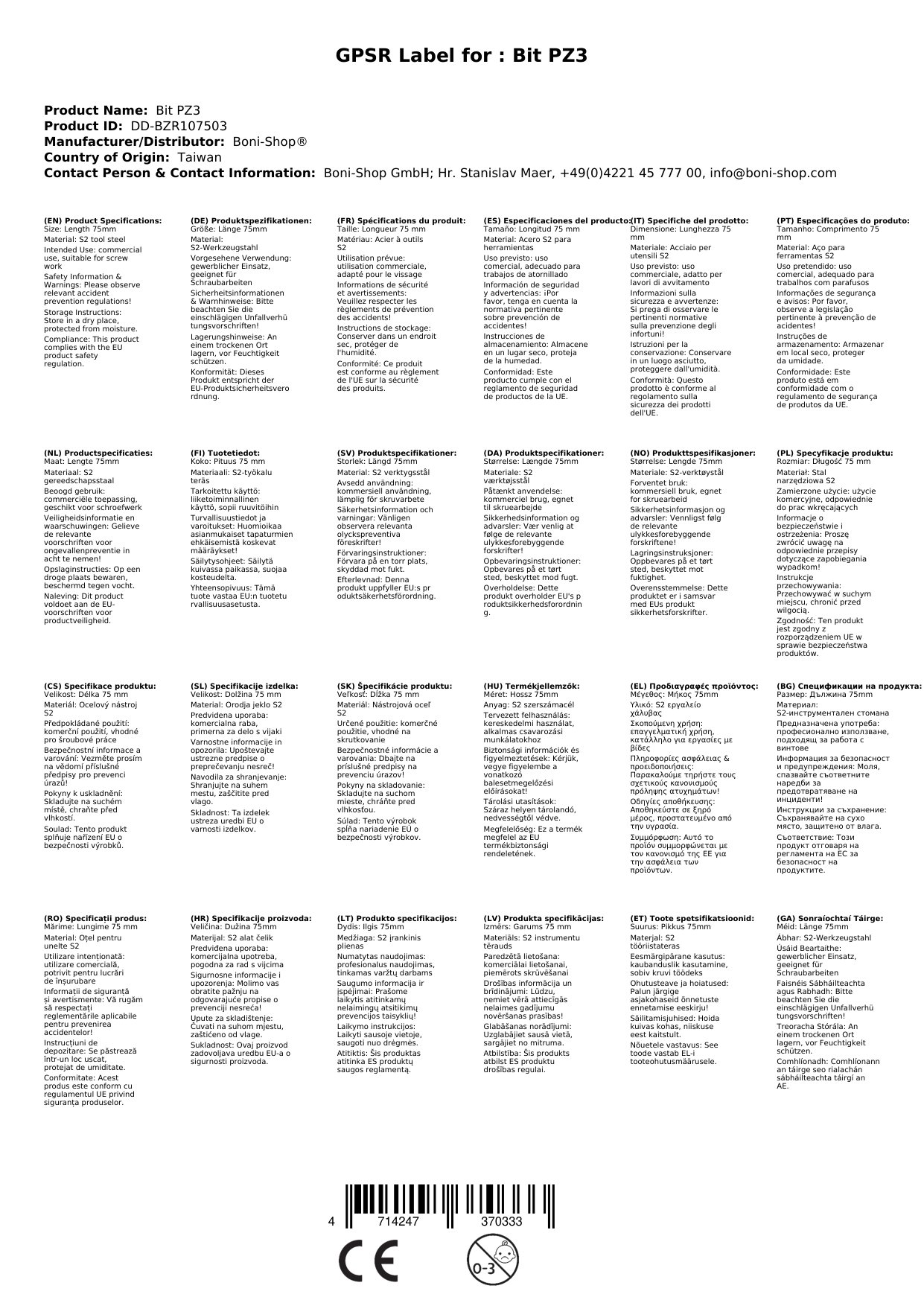Cuireann ár nGiotán PZ3 feidhmíocht iontaofa ar fáil duit do do chuid oibre scriú. Déanta as cruach S2 ardchaighdeáin agus le fad 75mm, tá sé idéalach le haghaidh úsáide gairmiúla. Cinntíonn an caighdeán tionsclaíoch saolré fada. Cén fáth a bhfuil sé seo tábhachtach duitse: Faigheann tú uirlis buan a sheachadann torthaí beachta fiú faoin ualach is airde.