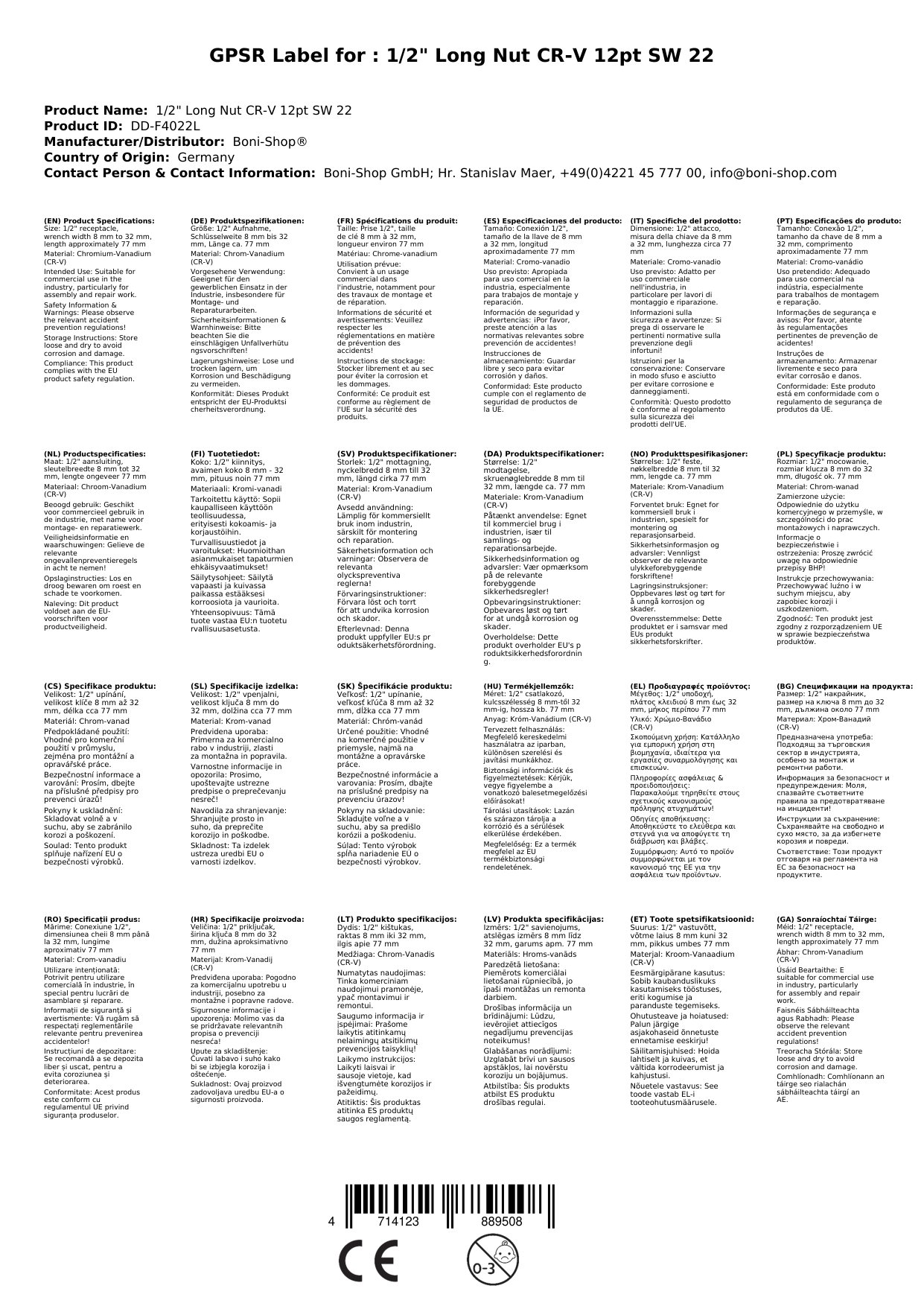 Faigh taithí ar an Soicéad Tionsclaíoch 22mm láidir agus buan ó Boni-Shop, déanta as cruach cróimiam-vanadium (CR-V) ardchaighdeáin. Tá an soicéad fada seo le tiomántán 1/2 orlach agus glacadh beacht 12 phointe foirfe d'obair scriú dian sa tionscal, le deisiúcháin carranna paisinéirí agus i dtionscadail cóimeála eile. Tá raon leathan leithead trasna árasán 22 mm ag an uirlis, rud a fhágann go bhfuil sé an-versatile. Ligeann an dearadh fada duit rochtain a fháil ar scriúnna atá deacair a bhaint amach, ionas gur féidir leat torthaí gairmiúla a bhaint amach fiú i limistéir chúng.