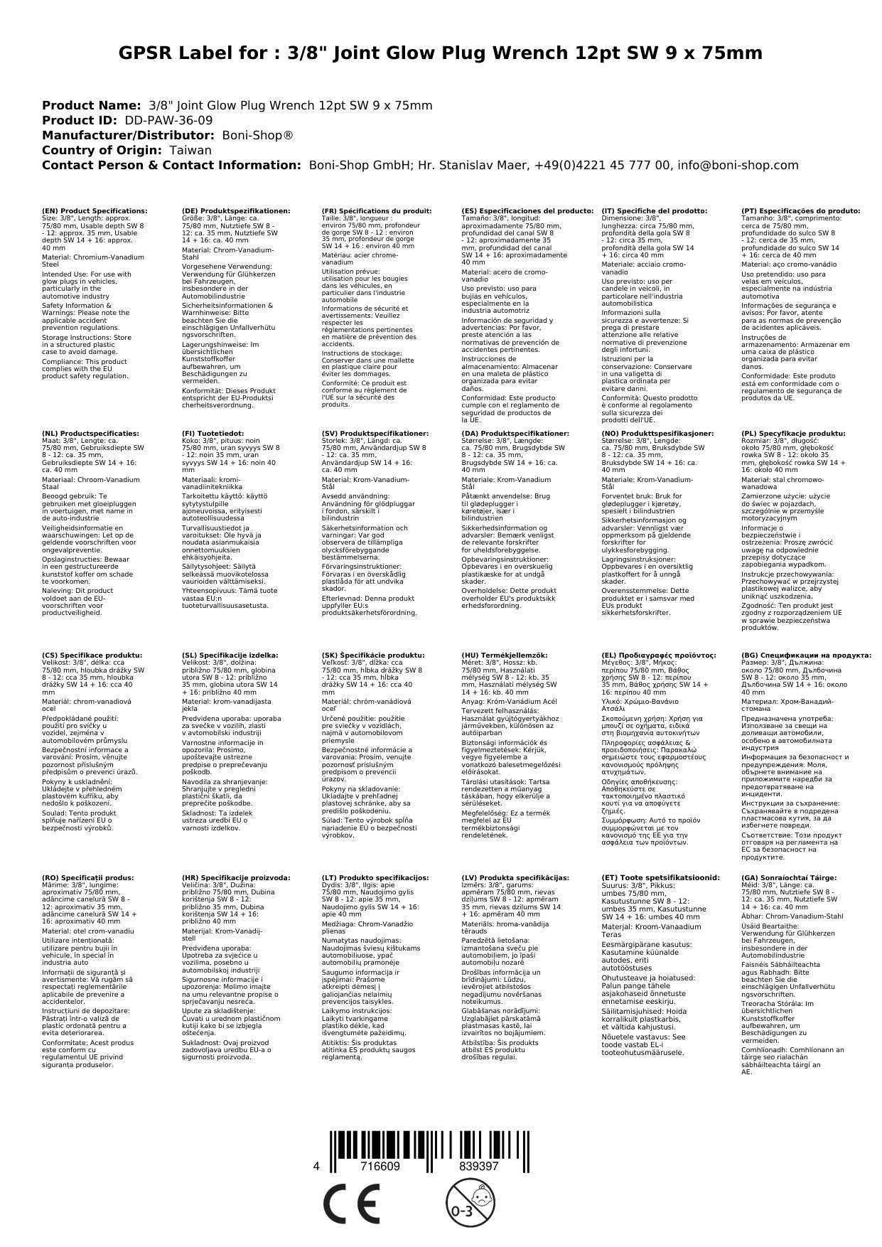 Tá an eochair oiriúnach do spárkachórais le méideanna eochair 8, 9, 10, 12, 14 agus 16 mm. Seiceáil sula gceannaíonn tú cén méid eochair a theastaíonn ó do spárkachóras.
