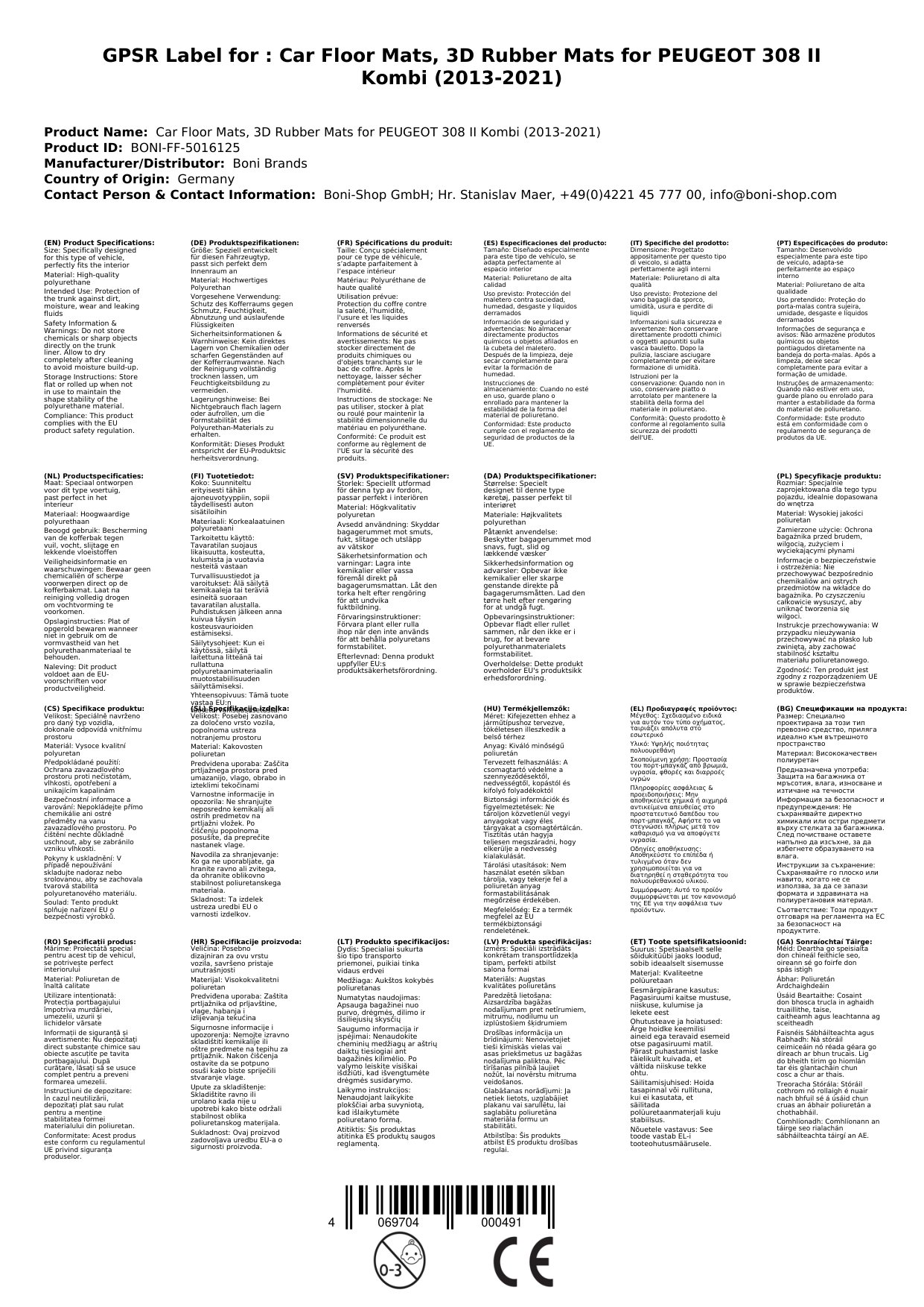 - Feistiú Cruinn 100%: Déantar na mataí urláir cruinne a mhonarú trí theicneolaíocht scanadh 3D beacht, go sonrach do do Peugeot 308 II Kombi.