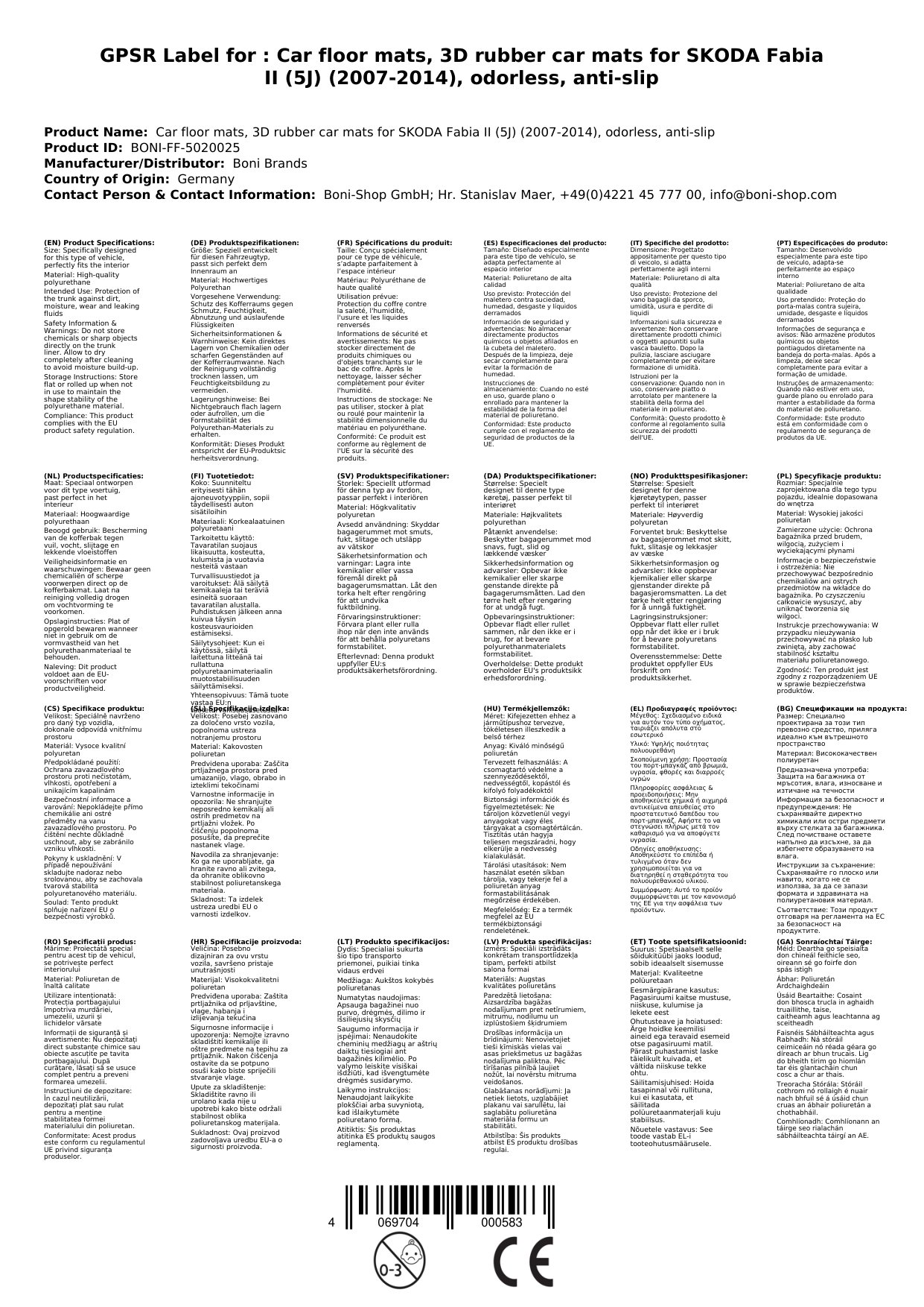 Deartha go sonrach le haghaidh SKODA Fabia II (2007-2014). Cinntíonn an teicneolaíocht scanadh 3D go bhfuil siad 100% cruinn ar urlár an chairr. Déanta as polúireatán ardchaighdeáin atá gan bholadh. Cosnaíonn imill arda ar leachtanna agus salachar. Tá dromchla frith-duillín acu le haghaidh sábháilteachta breise. Coinníonn siad urlár do charr tirim agus glan, fiú sna coinníollacha aimsire is measa.
