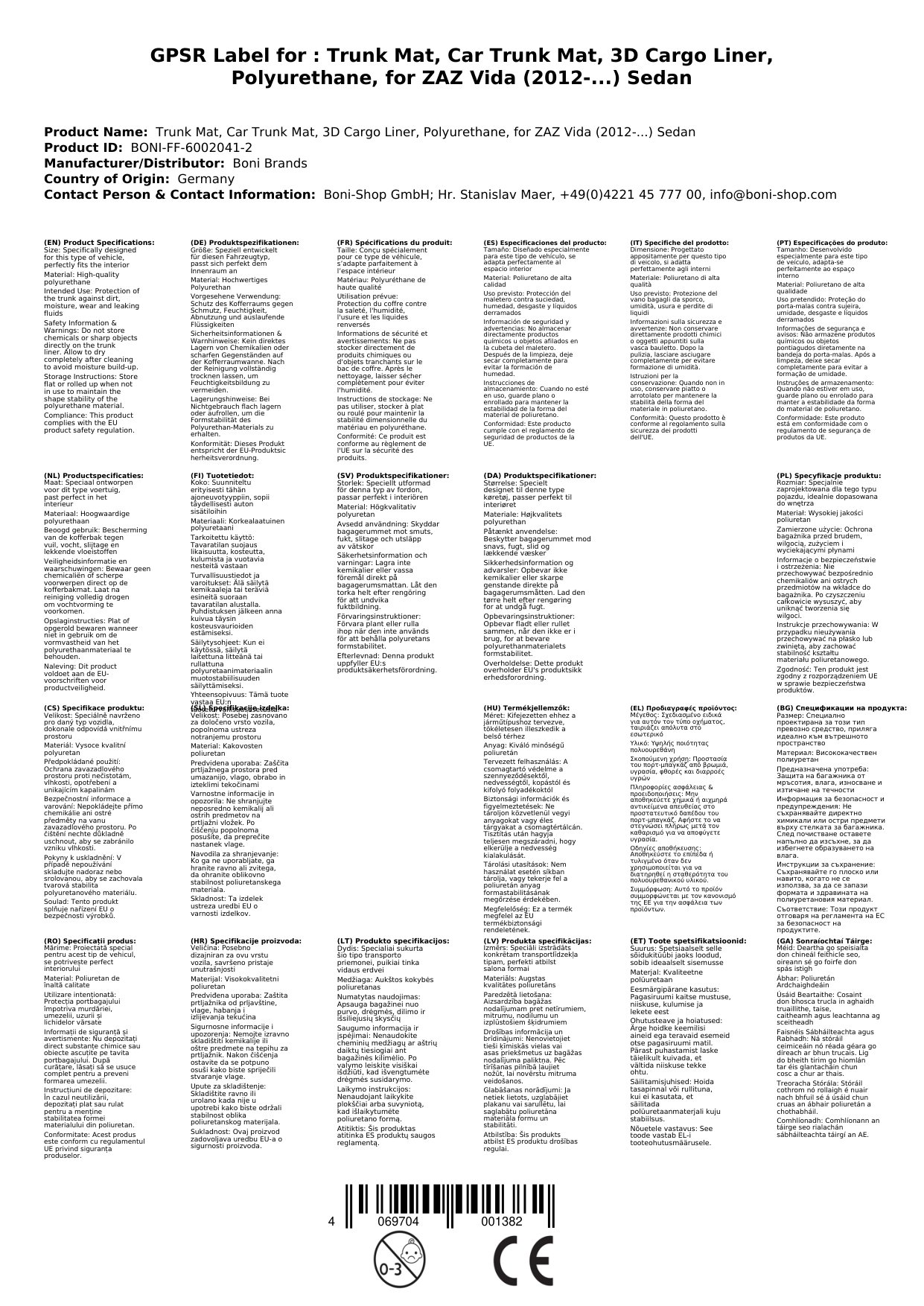 Cosain stoc do ZAZ Vida sedan (ó 2012 ar aghaidh) leis an mata buataisí 3D ardchaighdeáin seo. Tá an líneáil buataisí seo déanta as polúireatán láidir, cruinn-fheistiú, agus cruthaithe go speisialta chun cosaint iomlán a thabhairt do stoc do charr. A bhuí le teicneolaíocht scanadh 3D nua-aimseartha, luíonn an mata go foirfe le cruth stoc do charr, ag cosc earraí ó sleamhnú timpeall agus ag coinneáil smionagar agus leachtanna ar shiúl. Réiteach iontach más tábhacht leat glaineacht, ord, agus luach do charr a chosaint.