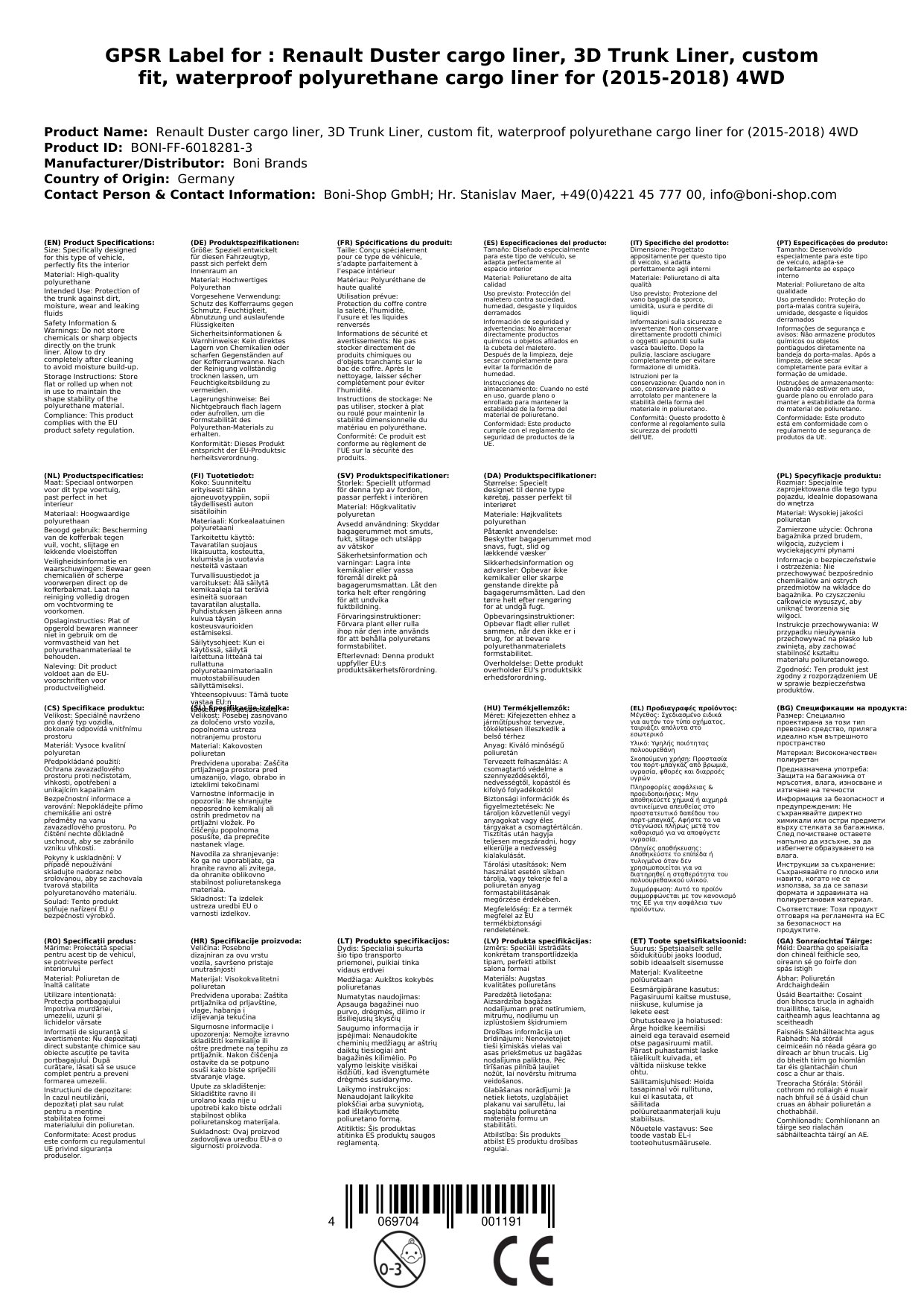 - Oiriúnacht Foirfe: A bhuíochas le múnláil 3D saincheaptha, luíonn an mata tosaithe gan uaim le comhrianta do RENAULT Duster (2015-2018) 4WD – níos fearr ná mataí uilíoch. Faigheann tú mata tosaithe aonair a oireann go díreach do d’fheithicil.
