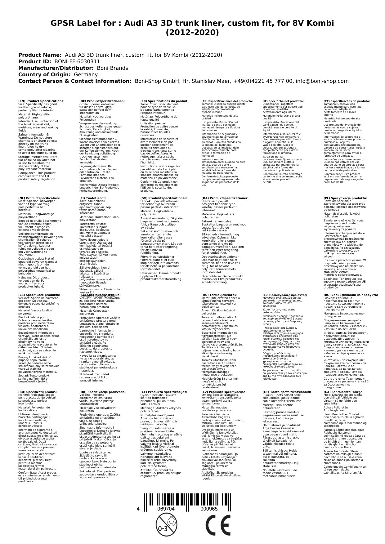 Tá an mata tosaithe seo deartha go sonrach do Audi A3 8V Kombi (2012-2020). Úsáideann sé teicneolaíocht scanadh 3D chun a chinntiú go n-oireann sé go foirfe do do thosaithe. Tá sé déanta as polúireatán láidir, rud a chiallaíonn go seasfaidh sé in aghaidh caitheamh agus salachar. Plus, níl aon bholadh air, mar sin fanfaidh cáilíocht istigh do Audi A3 ar fheabhas. Gheobhaidh tú réiteach tosaithe atá éasca le glanadh agus buan.