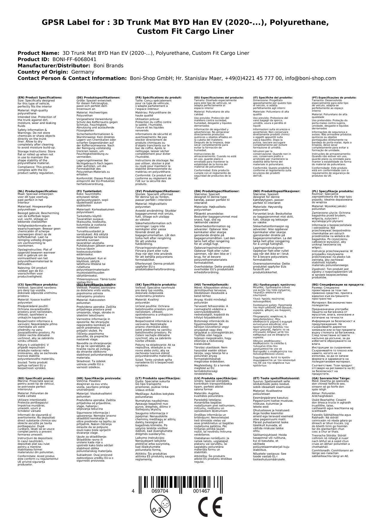 Cosain tosaithe do BYD Han EV (ó 2020 ar aghaidh) leis an líneáil tosaithe 3D ardchaighdeáin seo. Dearadh speisialta chun cosaint den scoth a thabhairt ar bhruscar, taise agus caitheamh. Teicneolaíocht scanadh 3D a chinntíonn go n-oireann sé go beacht do do charr. Tá sé buan, feidhmiúil agus coinníonn sé luach do charr.