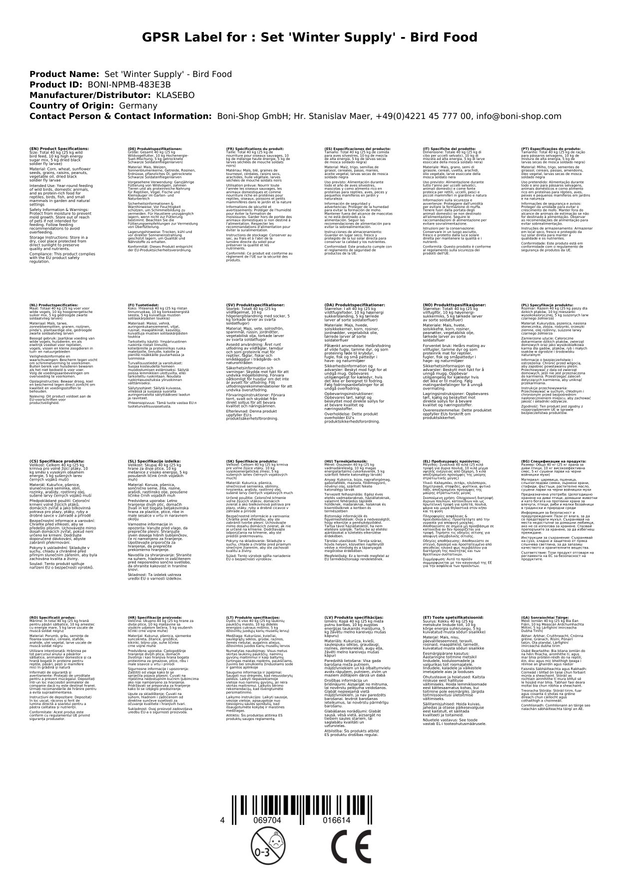 Cuimsíonn an tsraith 25 kg de bhia scaipthe ó arbhar, cruithneacht agus síolta lus na gréine do éin dhúchasaigh, 10 kg de mheascán suet ardfuinnimh le raisíní agus piobaróga do próitéin agus saille breise, agus 5 kg de larbhaí eite bhata dubha triomaithe mar fhoinse in-athnuaite calciam agus próitéin. Foirfe do bheathú éan sneachta agus beathú éan i rith na bliana, uile i bpacáiste praiticiúil 40 kg a shábháil am agus costas.
