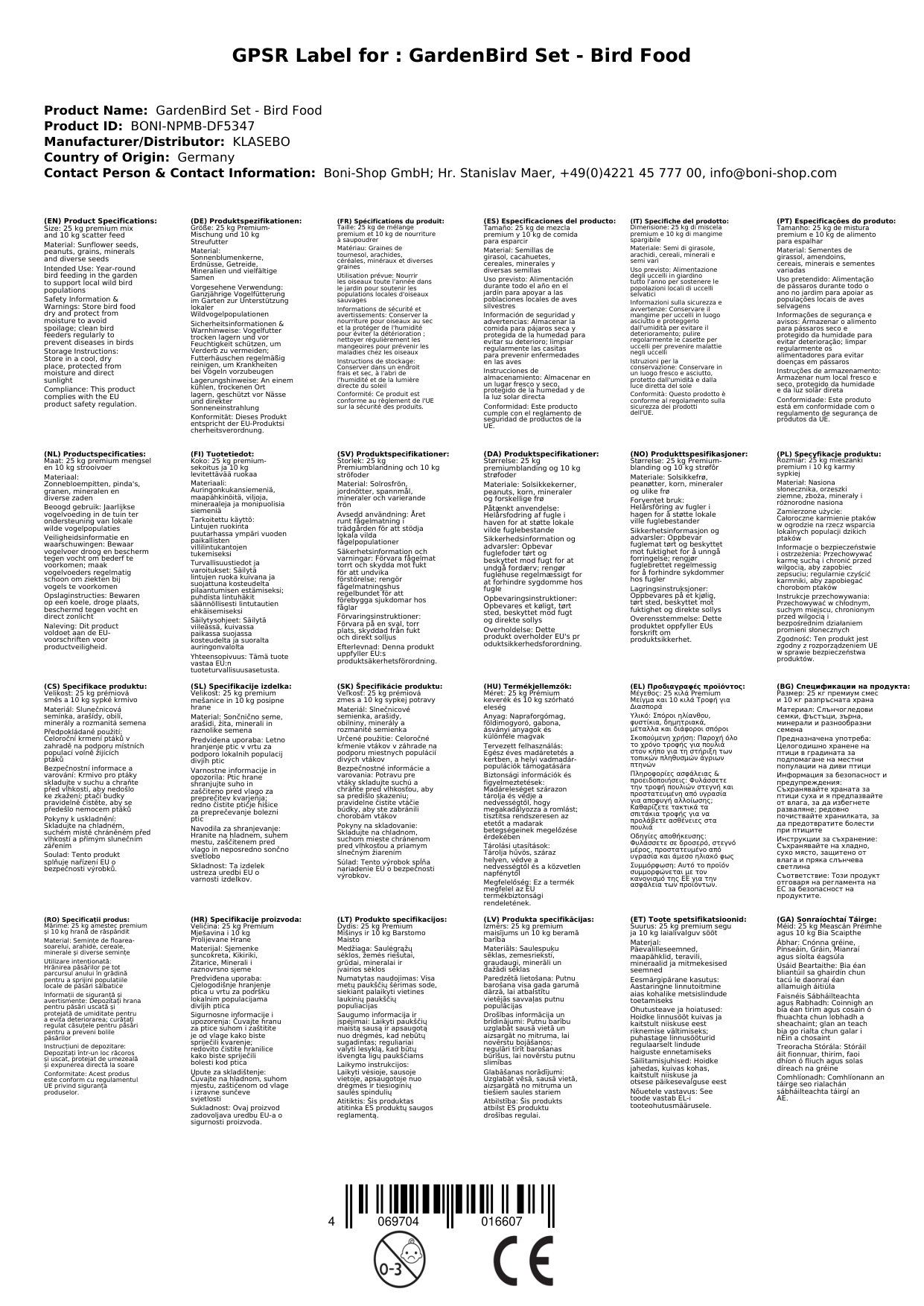 Cuimsíonn an sraith 25kg de Phréimhbhia Éan déanta as síolta gréine, píseanna talún, grán agus mianraí, chomh maith le 10kg de bhia scaipthe ildánach; tá sé rialaithe le haghaidh ambrosia agus optamaithe do an gheimhridh, an séasúr pórúcháin agus tréimhsí idirghabhálacha.