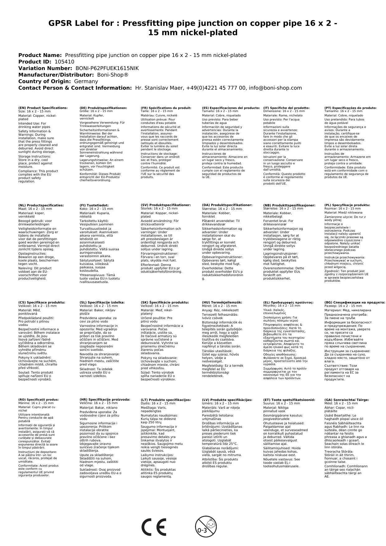 Aistriú Feadán Feistiú Brú ar Fheadán Copair 16 x 2 - 15 mm nicilithe