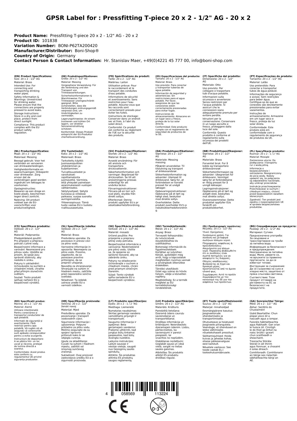 T-Píosa Preasfheistithe Práis, 20mm, 1/2" AG, DVGW