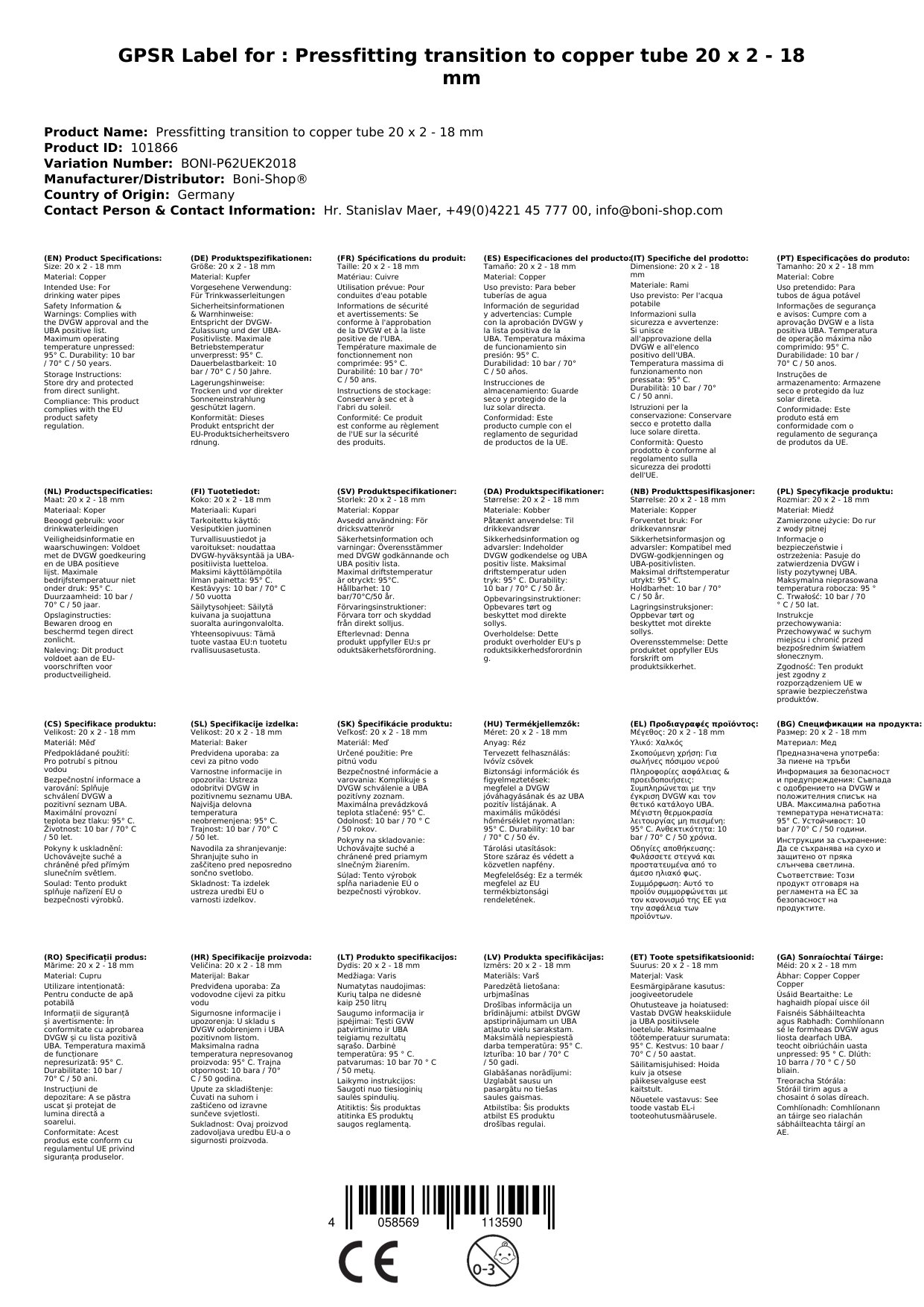 Cuir ceist chun níos mó a fhoghlaim faoin táirgeAistriúchán Preasfitting go Píobán Copair 20 x 2 - 18 mm