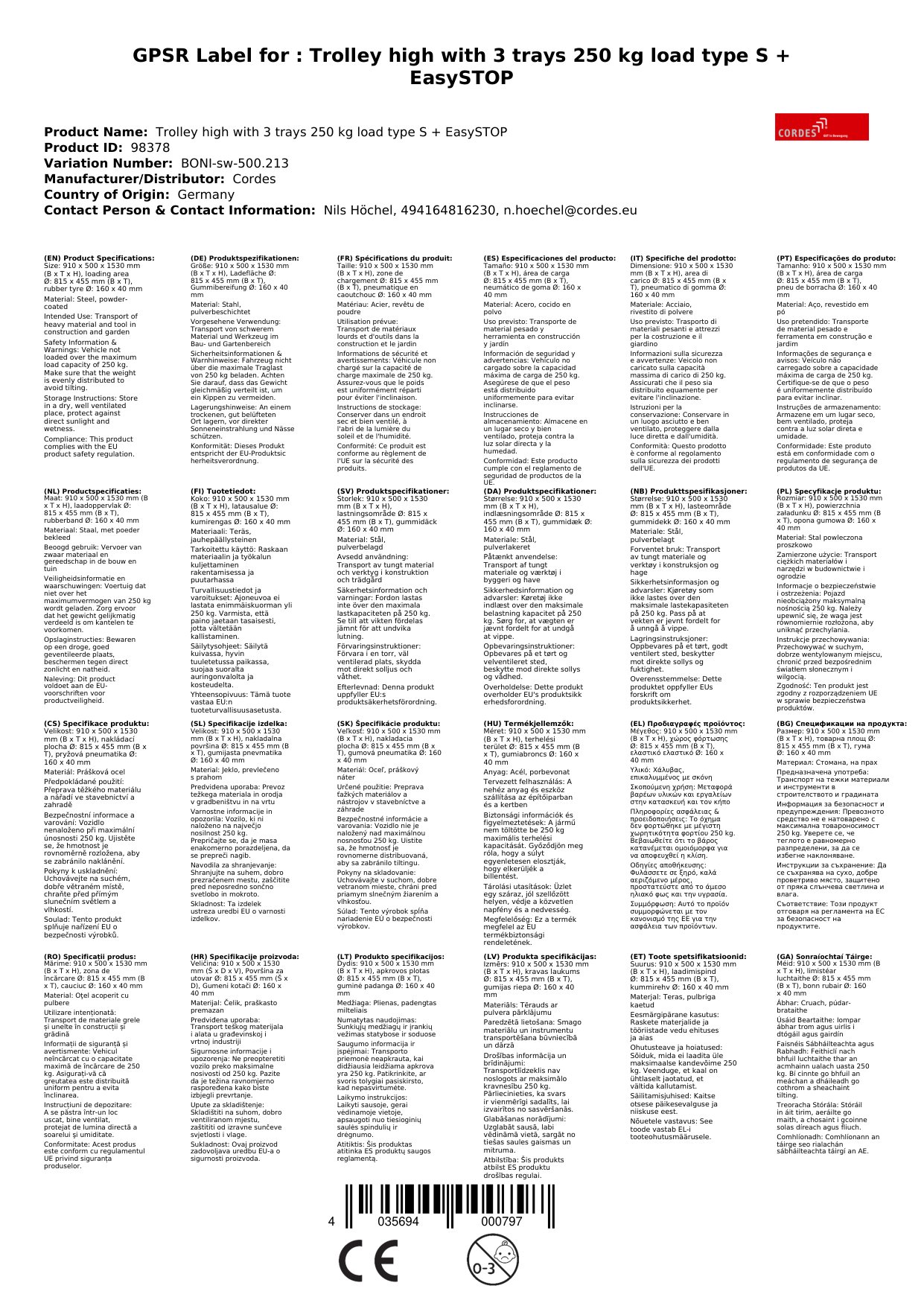 - Céim 2: Lódaigh na tráidirí le huirlisí, ábhair nó earraí eile. Bí cinnte nach sáraíonn tú an cumas ualaigh uasta de 250 kg.