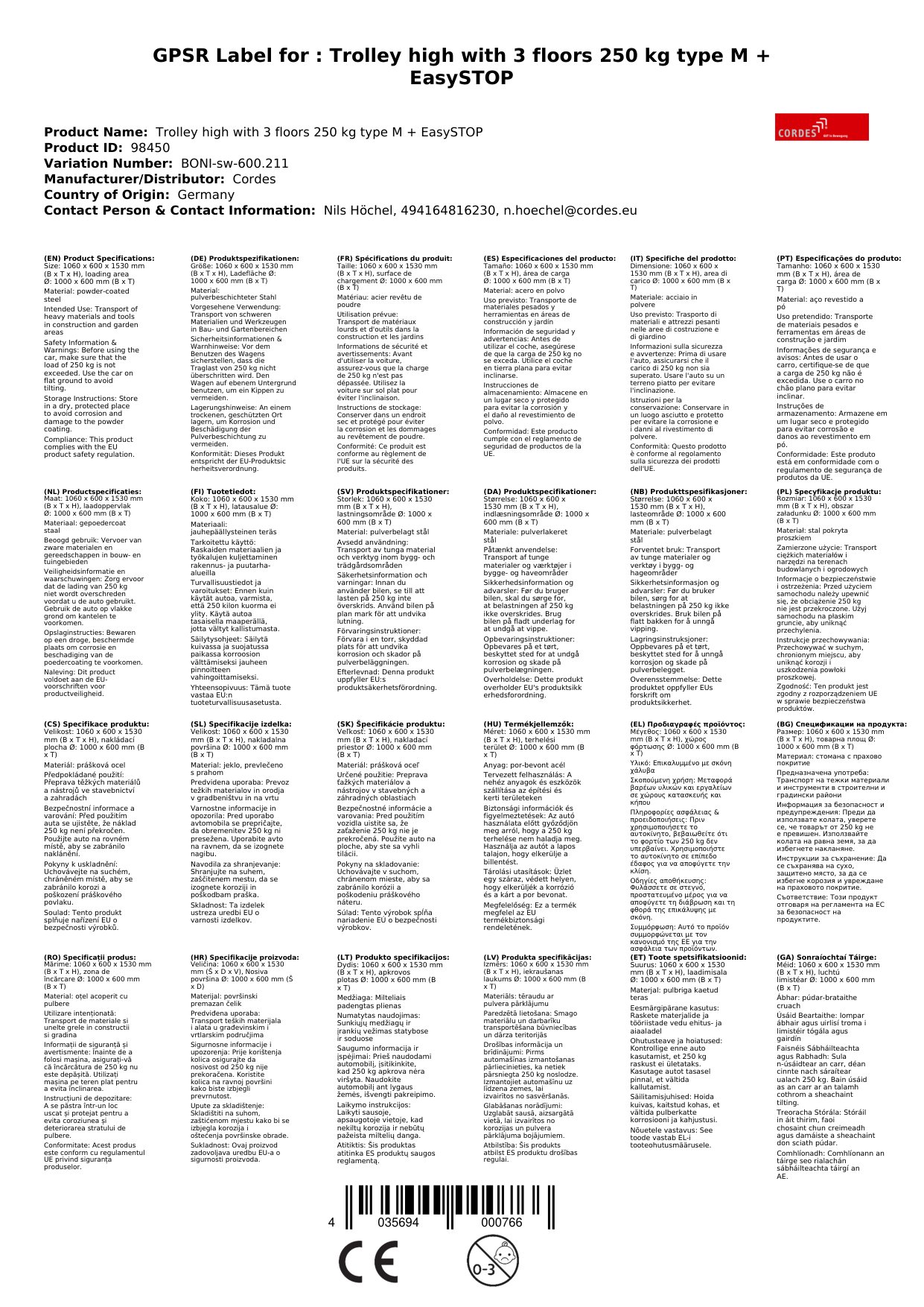 | 1060 x 600 x 1530 mm | 250 kg | 1000 x 600 mm | Rubair, Ø 160 x 40 mm | Gorm (RAL 5010) |
