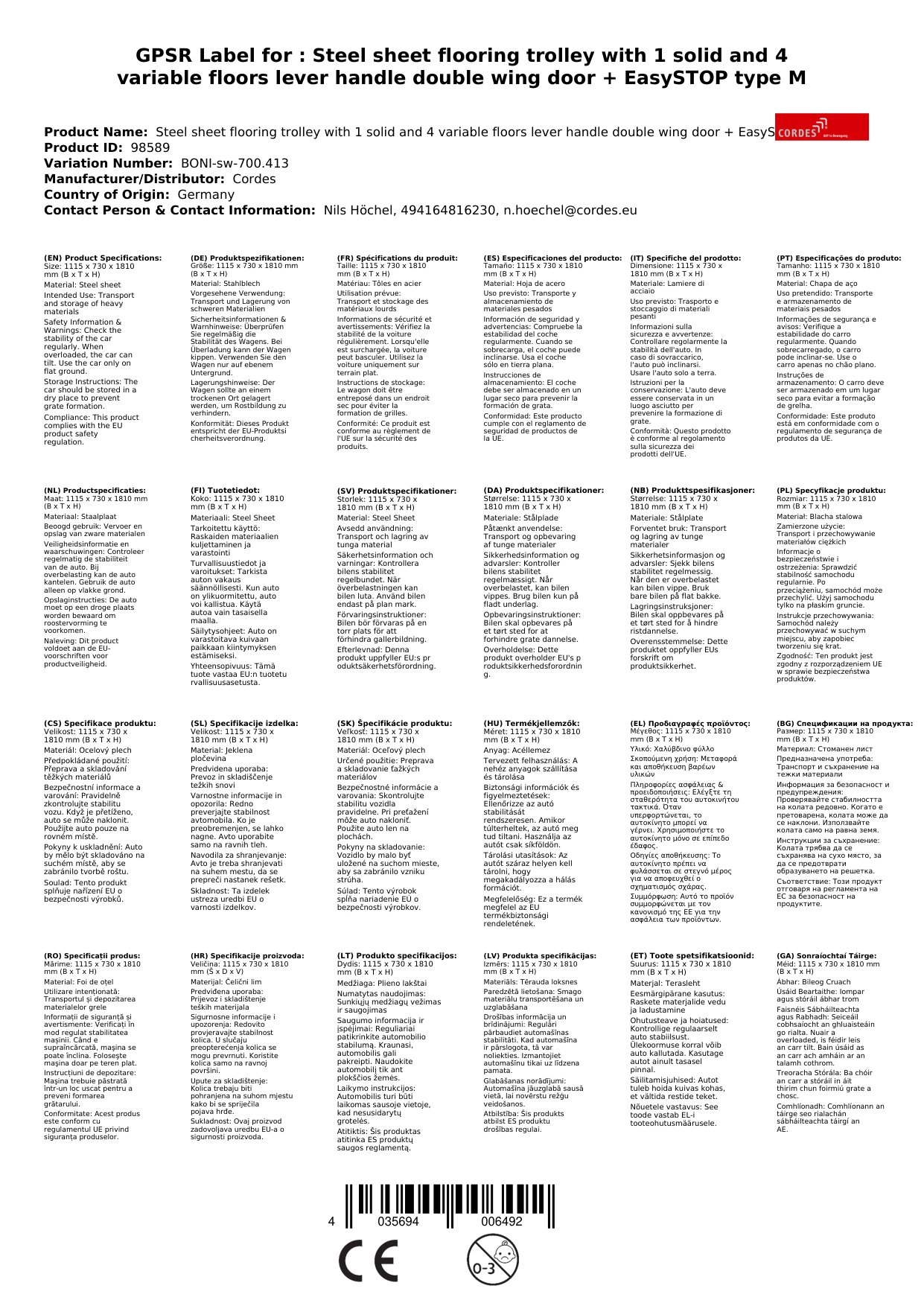 Cuireann ár dTrucail Stórála Cruach réiteach láidir ar fáil le haghaidh iompair agus stórála. Le cumas uasta 500 kg agus seilfeanna inathraithe, tá sé an-versatile. Cinntíonn an doras dúbailte inghlasáilte sábháilteacht. Ciallaíonn sé seo duit: cúntóir iontaofa agus sábháilte do do thascanna laethúla.