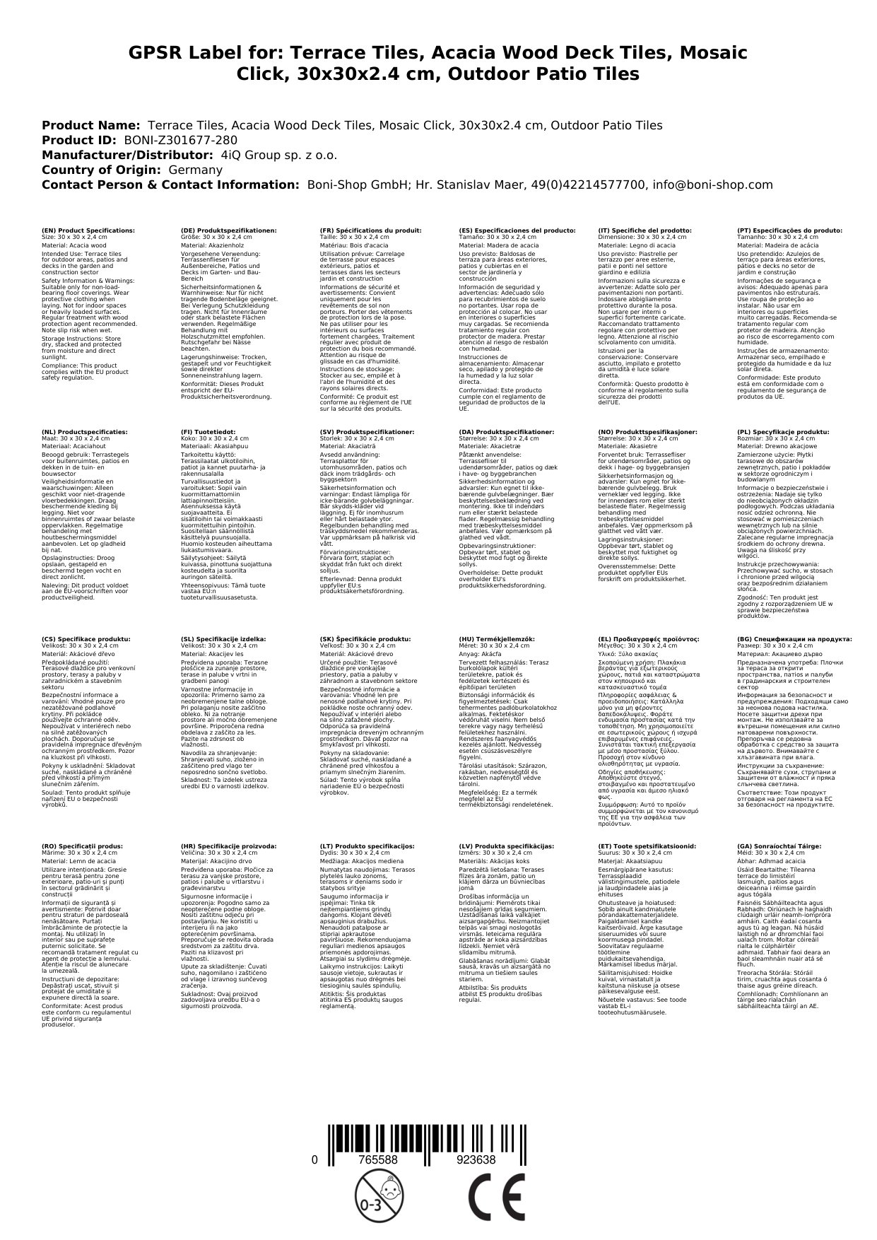 Claochlú do phatio nó do bhalcóin ina oasis compordach stylish lenár dtíleanna ardáin adhmaid acacia ardchaighdeáin. Comhcheanglaíonn na tíleanna Mósáic Cliceáil áilleacht nádúrtha le feidhmiúlacht phraiticiúil. A bhuíochas leis an gcóras cliceáil nuálaíoch, tá an suiteáil ina breeze - gan aon eolas speisialaithe ag teastáil. Bain sult as clúdach urláir durable agus resistant a fheabhsaíonn do spás lasmuigh.