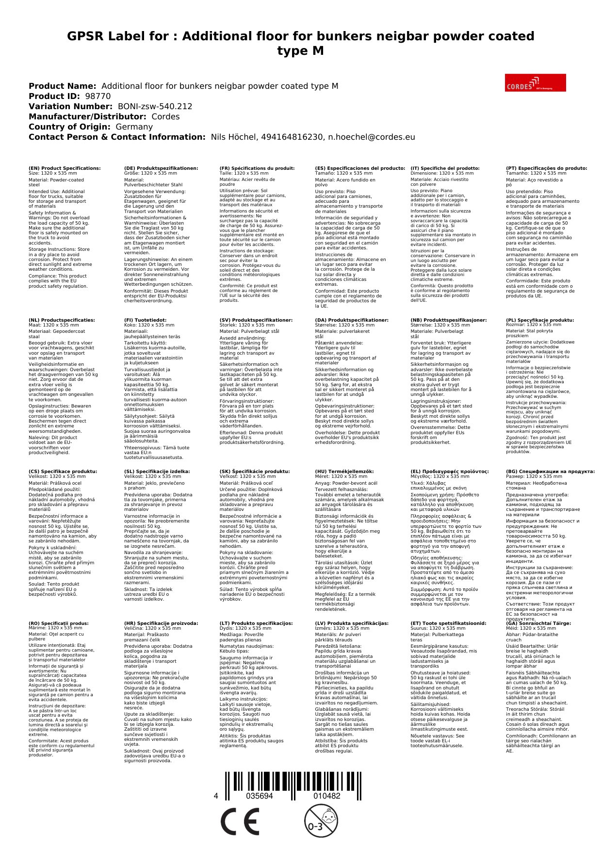 Bonn Breise le haghaidh Cart Urláir, Bonn Mogalra Sreinge, 1320x535mm, 50kg