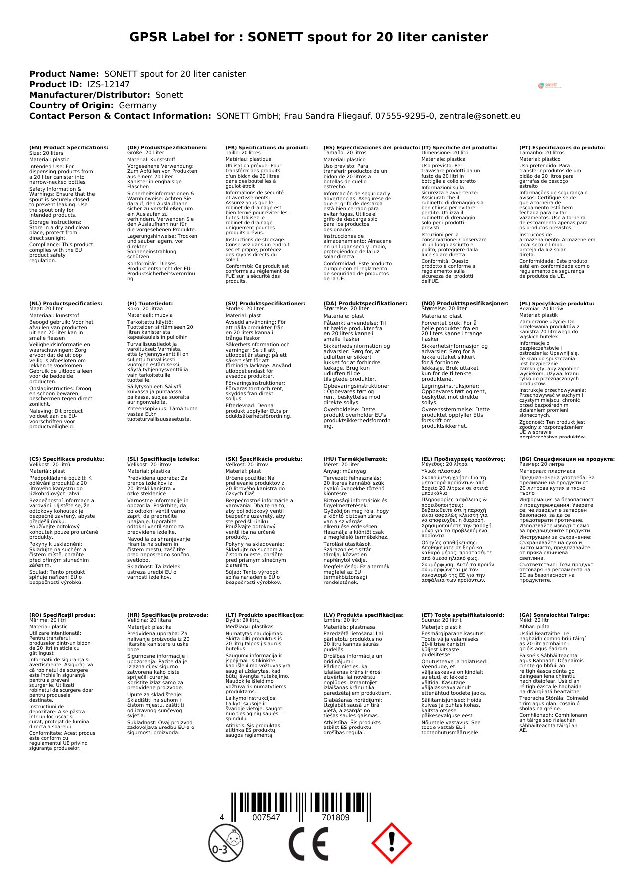 Tá an grúdaire seo deartha le haghaidh cannaí 20 lítear, ag cinntiú go n-oireann sé go foirfe. Tá sé déanta as ábhar láidir, marthanach a sheasfaidh le húsáid rialta. Leis an dearadh simplí, is furasta é a chur ar bun agus a úsáid. Cabhróidh sé leat leachtanna a dhoirteadh gan doirteadh ná praiseach.