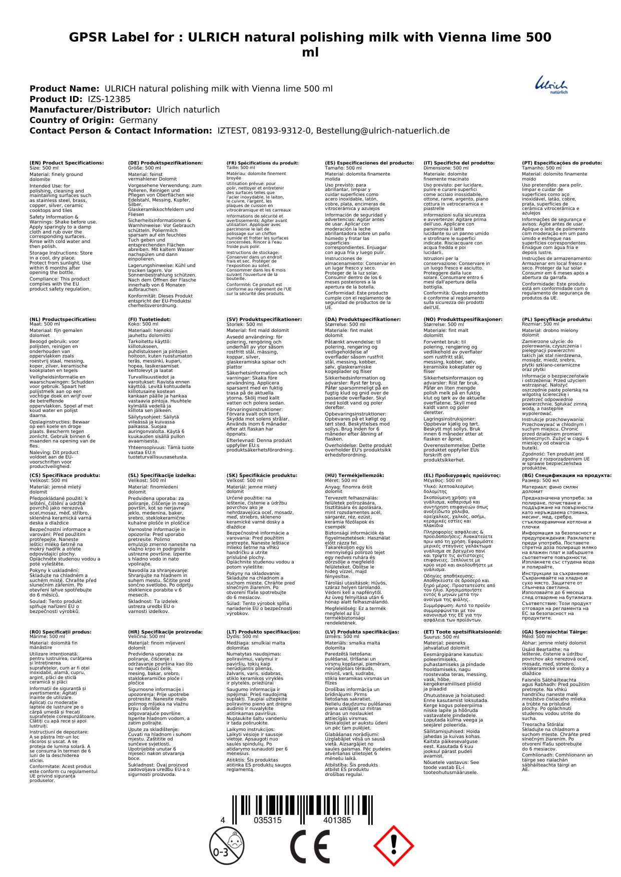 Cuir ceist chun níos mó a fhoghlaim faoin táirgePoliermilch 500 ml, Wiener Kalk, Glanadh nádúrtha, Táirge glantacháin