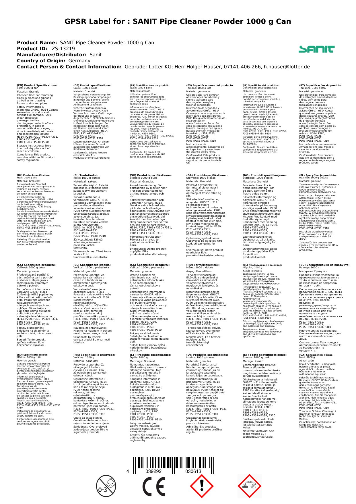Contúirt: Aicmiú de réir VO 1272/2008: H302 - Díobhálach má shlogtar. H318 - Déanann damáiste tromchúiseach do na súile.