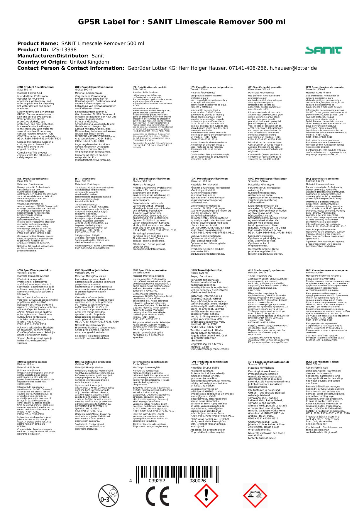 - P305/351/338 – MÁ THAGANN TEAGMHÁIL LEIS AN tSÚIL: Sruthlaigh go cúramach le huisce ar feadh roinnt nóiméad. Bain lionsaí teagmhála, má tá siad i láthair agus éasca le déanamh. Lean ort ag sruthlú.