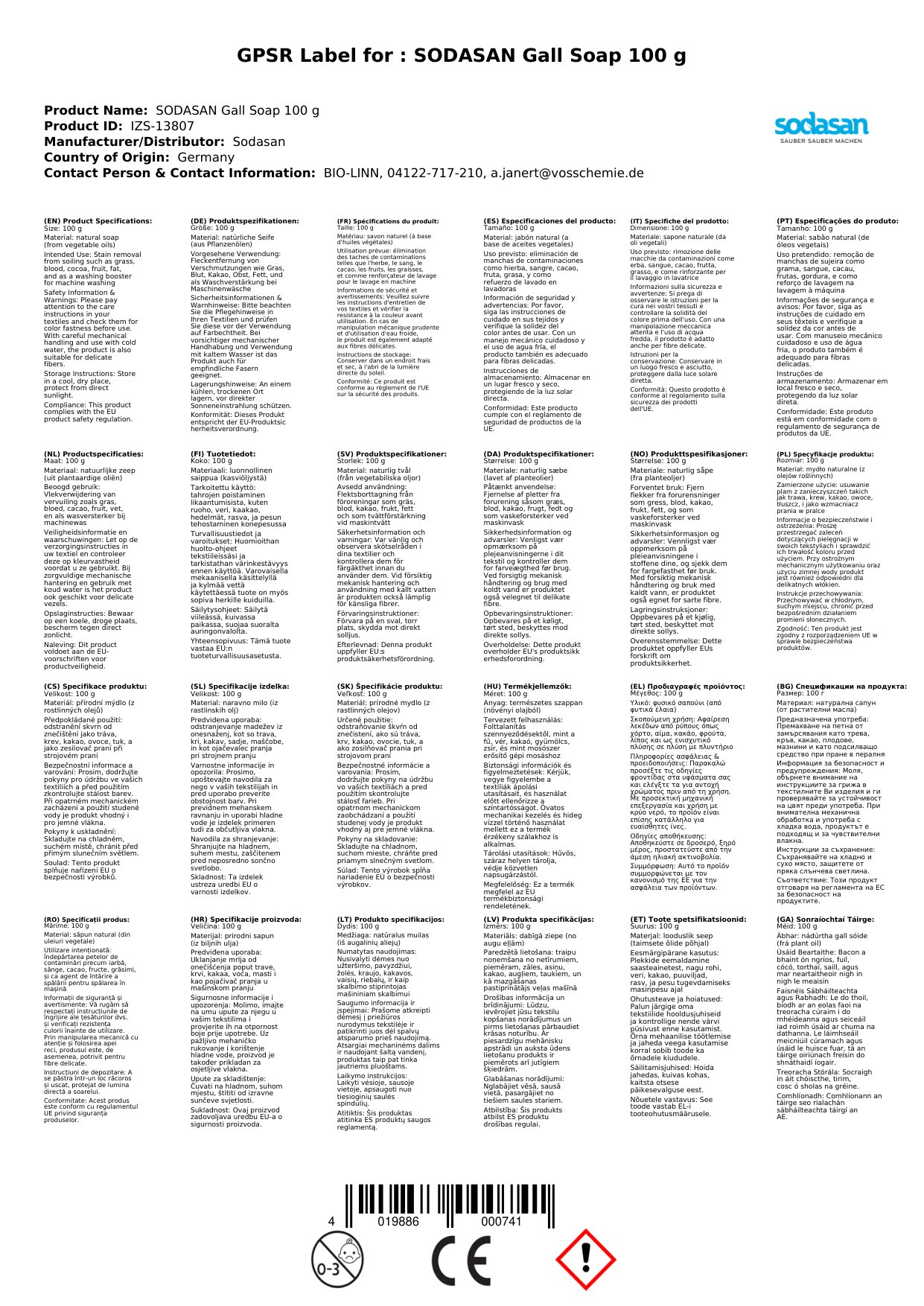 Tá ár Gallúnach Gall déanta as comhábhair nádúrtha orgánacha, lena n-áirítear gall ainmhithe, a bhfuil aithne air as a chumas stains a bhaint. Tá an gallúnach seo saor ó cheimiceáin chrua agus datháin shaorga, rud a fhágann go bhfuil sé sábháilte do gach cineál fabraice. Tá sé pacáistithe i bpíosa 100g, ionas go mairfidh sé tamall fada fiú le húsáid rialta. Tabhair aire do do chuid éadaí agus don timpeallacht le Gallúnach Gall!