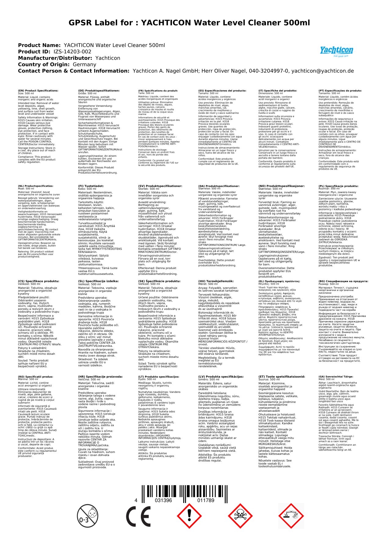 Contúirt: Aicmiú de réir VO 1272/2008: H302 - Díobhálach má shlogtar. H318 - Déanann sé damáiste tromchúiseach do na súile.
