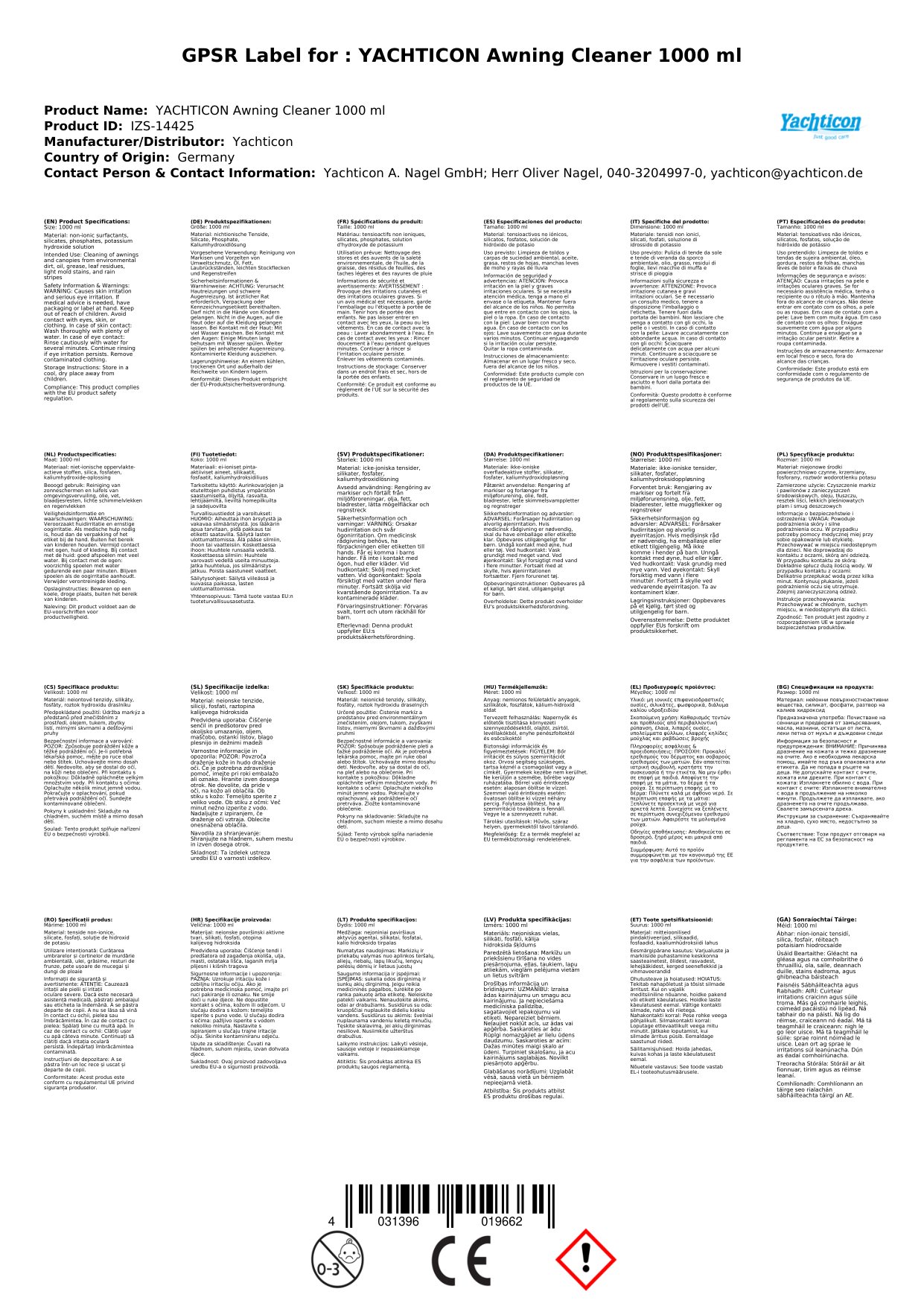- P305+P351+P338: I gcás TEAGMHÁIL LE SÚILE: Sruthlaigh go cúramach le huisce ar feadh roinnt nóiméad. Bain lionsaí teagmhála, má tá siad i láthair agus éasca a dhéanamh. Lean ort ag sruthlú.