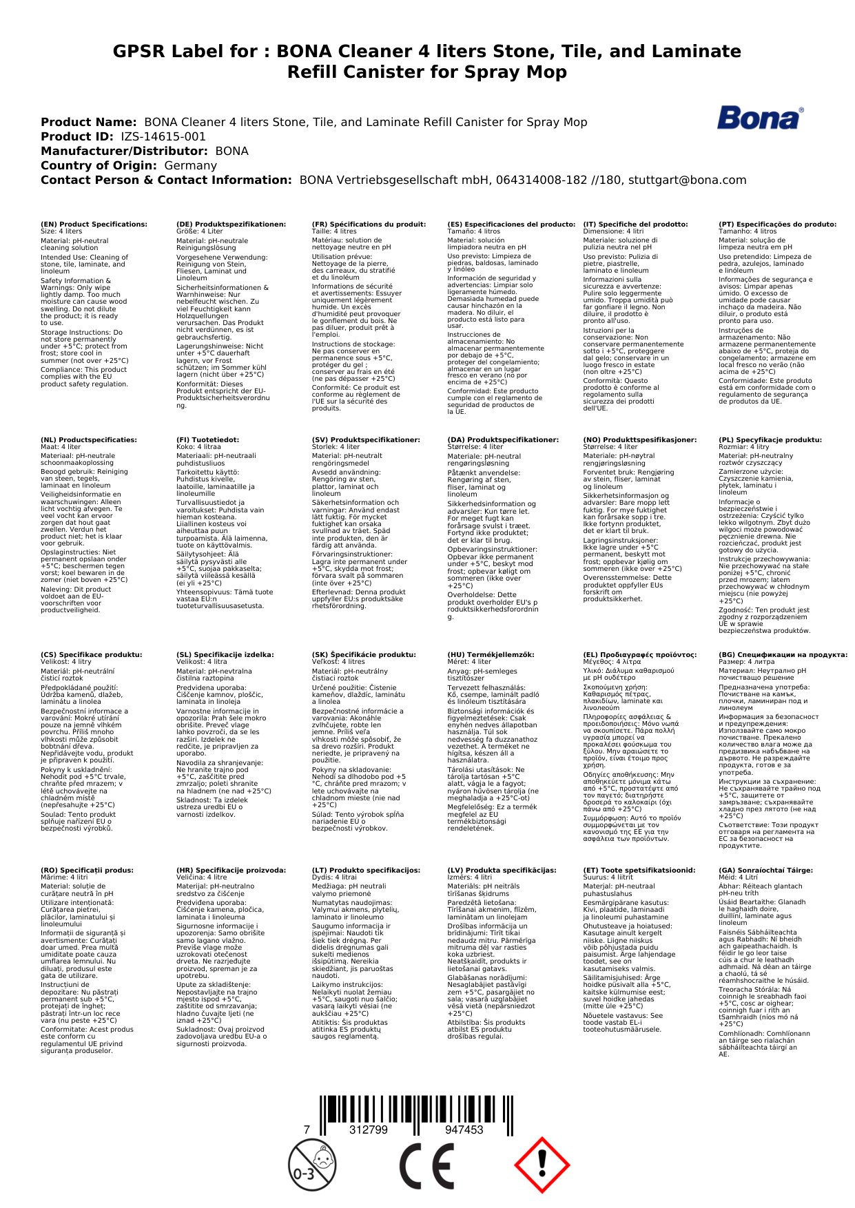 An bhfuil tú ag lorg réiteach glantacháin éifeachtach agus áisiúil do do theach? Tá ár Glanadh Bona 4 Lítear foirfe chun tíleanna, urláir lamináit, agus dromchlaí cloiche a ghlanadh gan stró. Is féidir leat é a úsáid mar athlíonadh do moip spraeála, rud a fhágann go bhfuil sé thar a bheith praiticiúil. Coinnigh do urláir glan agus slachtmhar leis an táirge iontach seo.