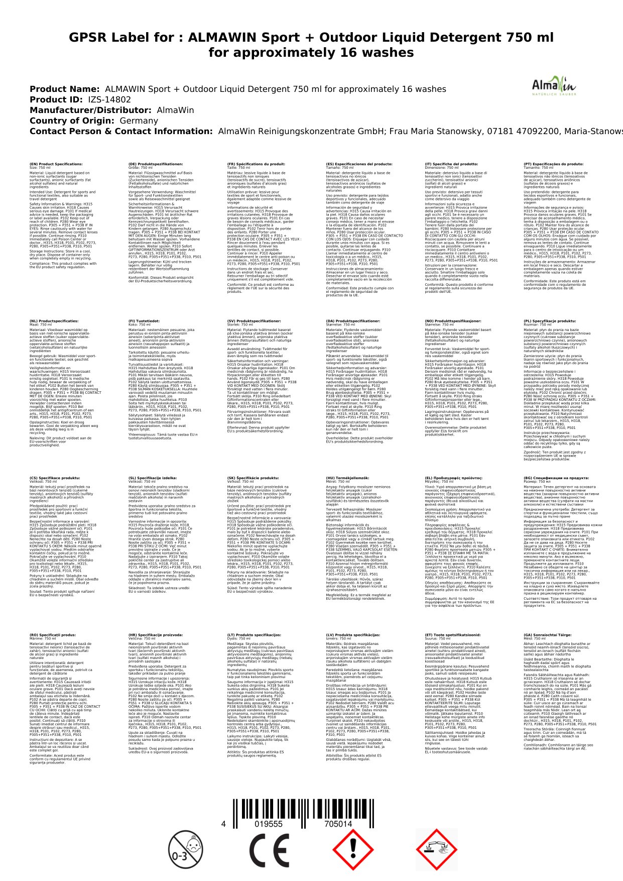 Contúirt: Aicmiú de réir VO 1272/2008: H302 - Díobhálach má shlogtar. H318 - Déanann sé damáiste mór do na súile.