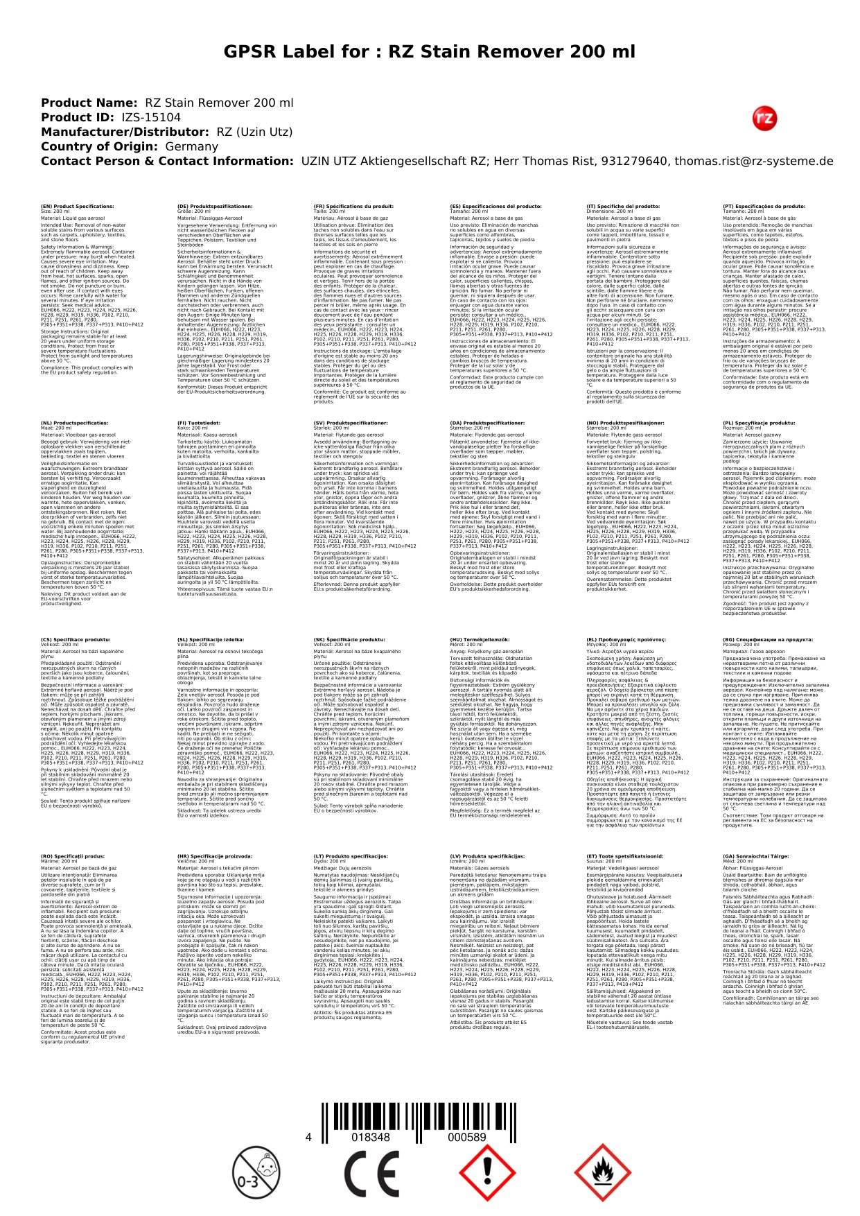 - P305+P351+P338 - I gcás teagmháil le súile: sruthlaigh go cúramach le huisce ar feadh roinnt nóiméad. Bain lionsaí tadhaill, má tá siad i láthair agus éasca a dhéanamh. Lean ort ag sruthlú.