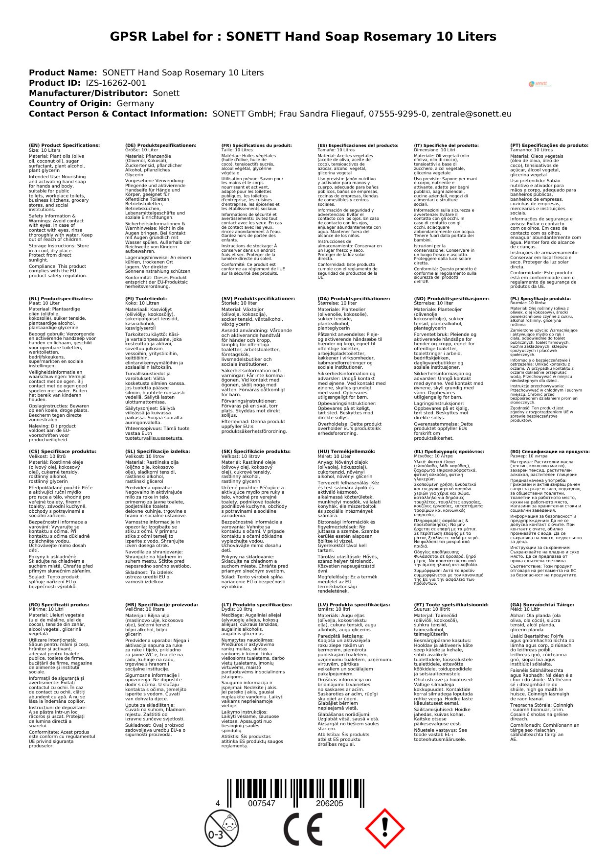 Tá an gallúnach láimhe seo déanta as comhábhair nádúrtha, lena n-áirítear ola Rosemary le haghaidh boladh úr agus airíonna antiseptic. Tá an coimeádán 10 lítear foirfe le húsáid sa bhaile nó i mbunaíochtaí tráchtála. Is rogha iontach é freisin dóibh siúd atá ag lorg gallúnach orgánach atá cairdiúil don chomhshaol. Seo gallúnach atá éifeachtach agus milis ar do lámha, á cinntiú go bhfanann siad glan agus hiodráitithe.