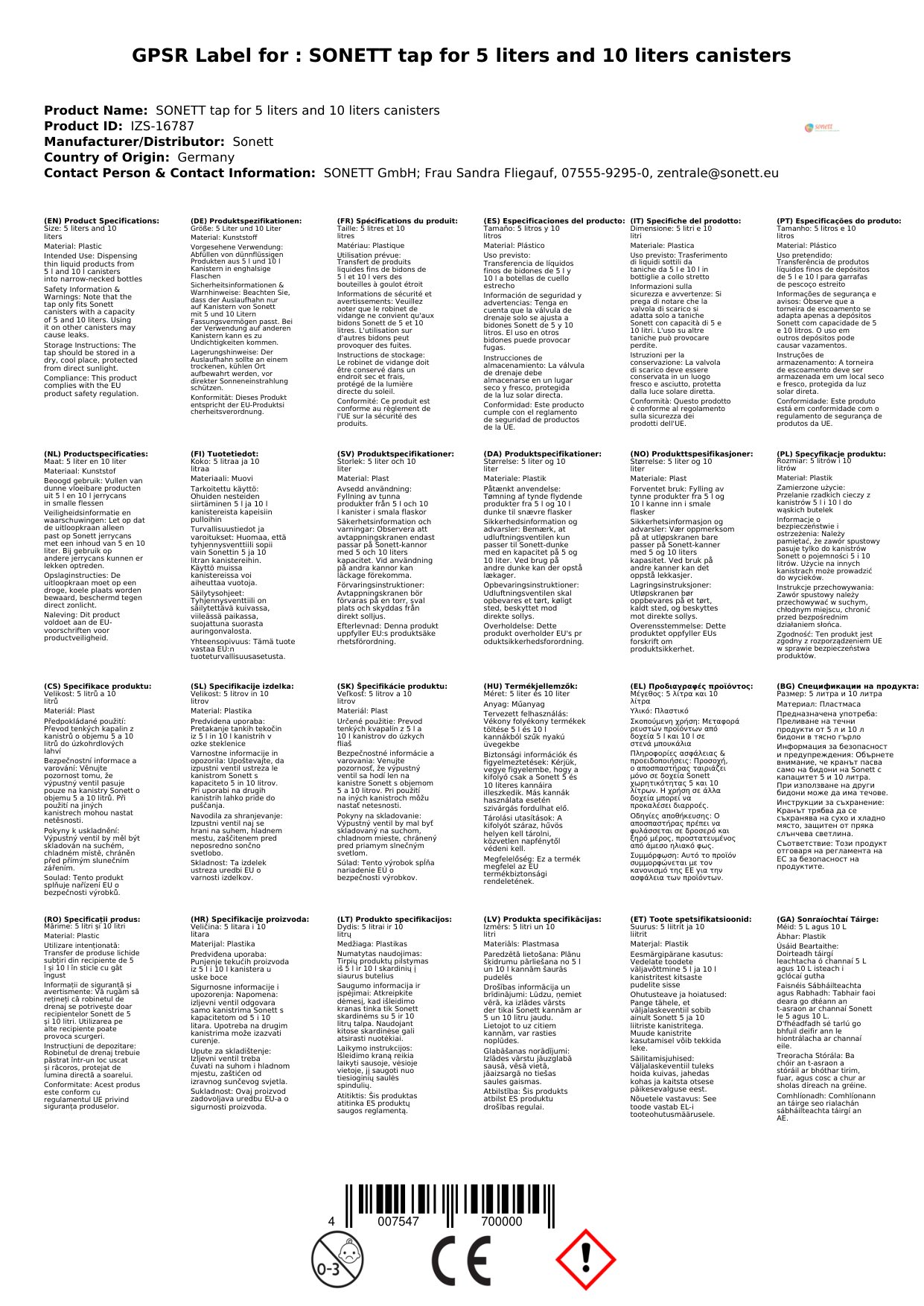 Cuir ceist chun níos mó a fhoghlaim faoin táirgeCrannán Sonett, crannán do chanistir 5 lítear, crannán 10 lítear