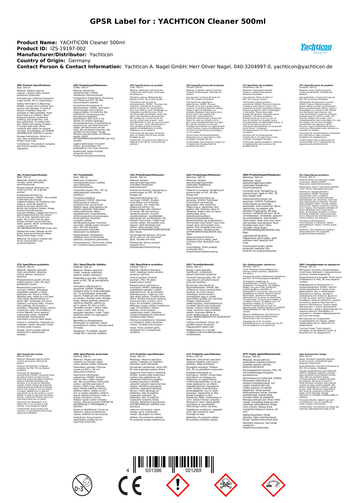 Contúirt: Aicmiú de réir Rialacháin (CE) Uimh. 1272/2008: H302 - Díobhálach má shlogtar é. H318 - Gortaíonn sé na súile go dona.