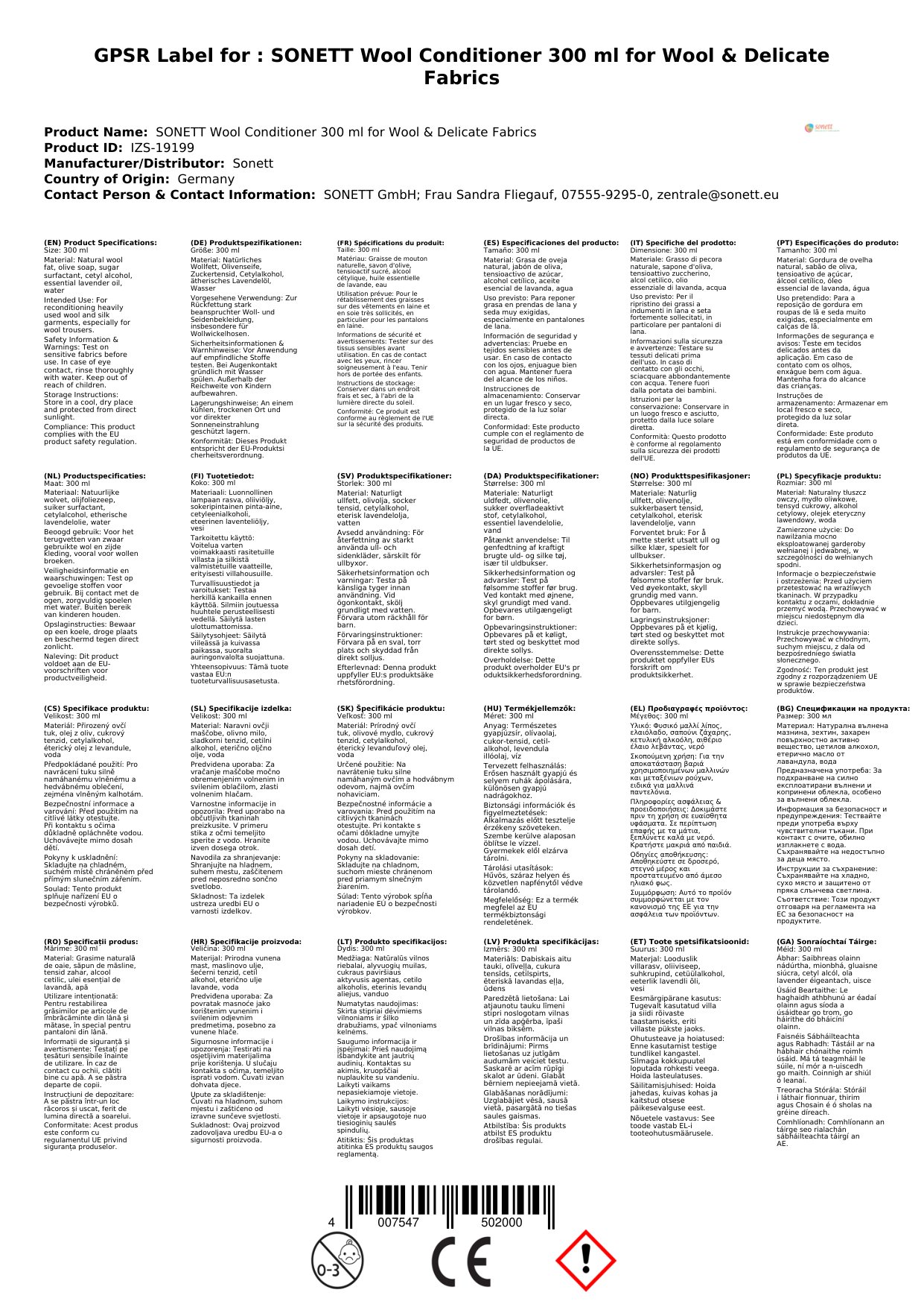 Le haghaidh níocháin láimhe, cuir 5-10 ml de Chúram Olann Sonett le babhla uisce te, tum na héadaí, fág ar feadh 10-15 nóiméad, sruthlaigh le huisce fuar, agus leag go cothrom le triomú.
