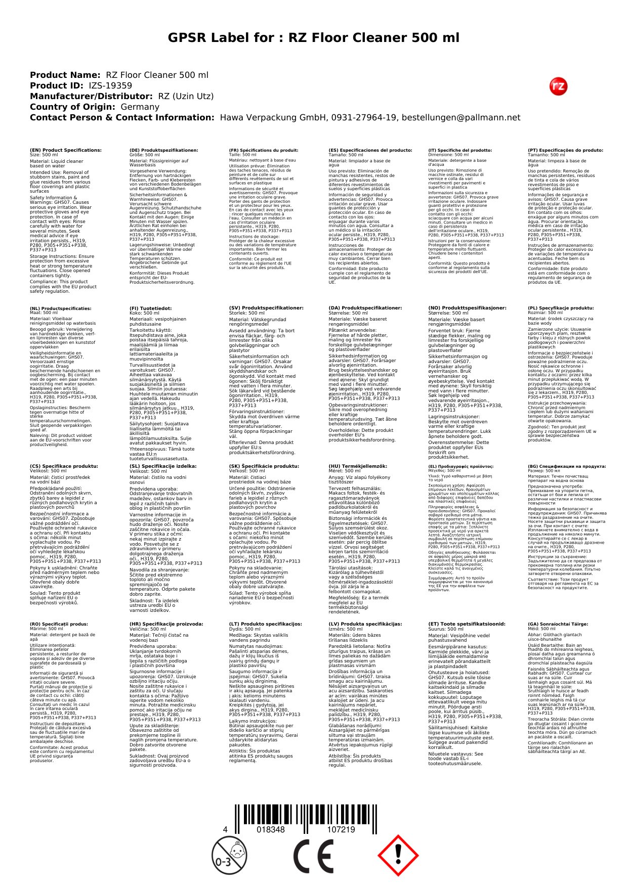 Cuir ceist chun níos mó a fhoghlaim faoin táirgeGlanadh urláir, Glanadh Tíleanna, RZ Boden Fleckenlöser 500ml, Glanadh Spotaí Urláir