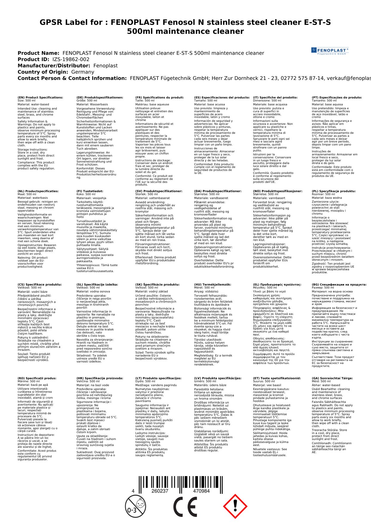 An bhfuil tú ag lorg réiteach éifeachtach chun do chuid cruach dhosmálta a choimeád ag taitneamh? Tá Glantóir Cruach Fenosol E-ST-S 500ml anseo chun cabhrú leat. Is glantóir speisialta é seo a bhaineann smálacha agus gráin go tapa agus go héasca. Leis, is féidir leat dromchlaí cruach dhosmálta a ghlanadh agus a chosaint, ag cinntiú go bhfanann siad lonrach agus cosanta ar feadh tréimhse fada. Fágann sé seo go bhfuil sé foirfe do do chistin, seomra folctha, agus níos mó.