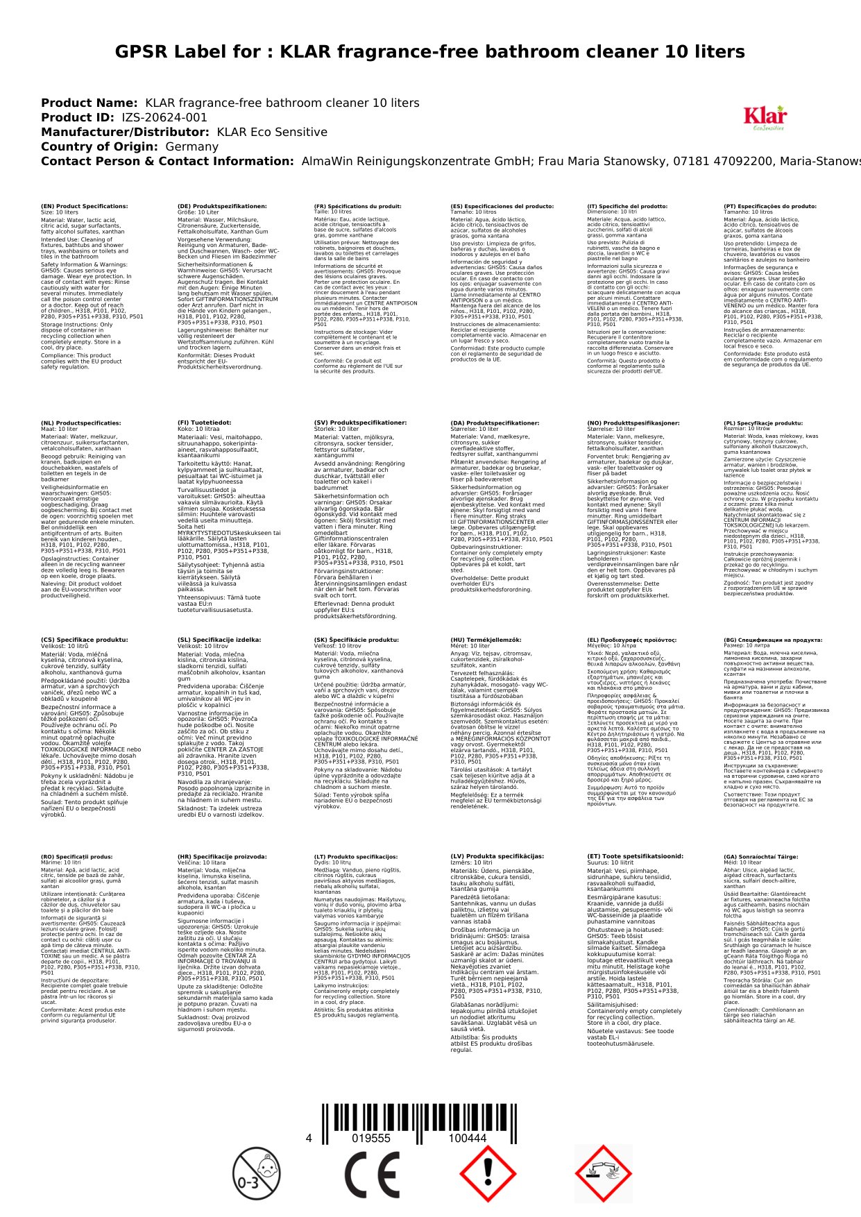 - Pacáiste Mór: Soláthraíonn an pacáiste 10 lítear go leor glantóir duit chun do sheomra folctha a choinneáil glan ar feadh tréimhse fada.