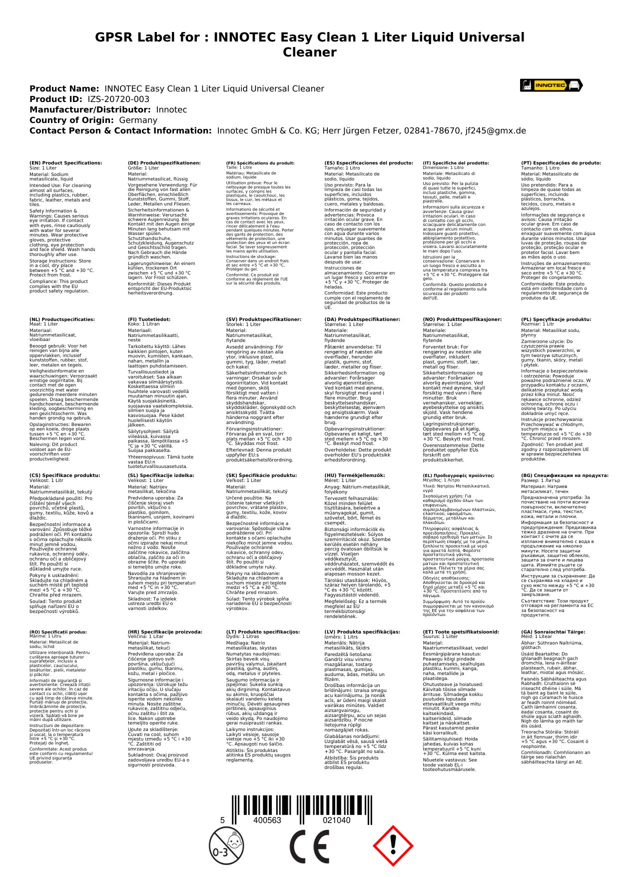 Glanadh uilíoch 1 Liter, Glanadh Éasca, Glanadh Leachtach