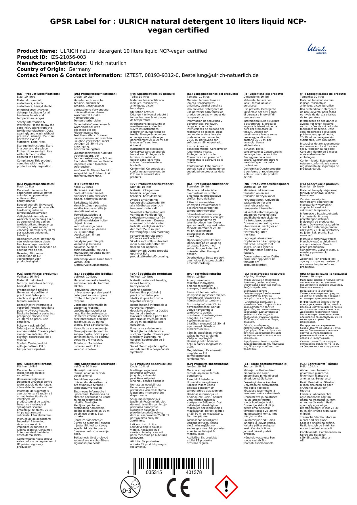 Tá Glanadháin Éadaí 10 Lítear deartha chun níochán éifeachtach a sholáthar agus iad ag cosaint an chomhshaoil. Tá an glantach seo nádúrtha, vegan agus deimhnithe. Leis an toirt 10 lítear, soláthraíonn sé go leor níochán le haghaidh úsáide fadtéarmaí. Tá sé oiriúnach do gach cineál éadaí, ag cinntiú go bhfanann do chuid éadaí glan agus úr ar bhealach nádúrtha.