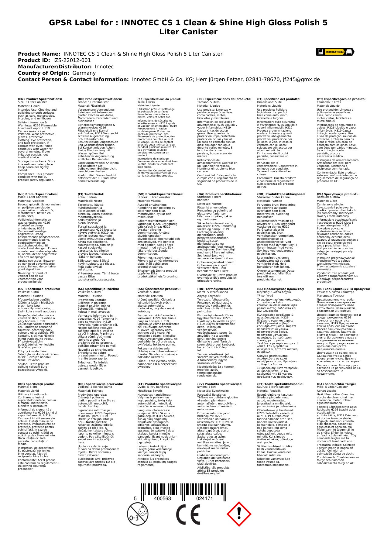 Snas ardghlóine 5 lítear, politúir ardghlóine, glantóir agus snas