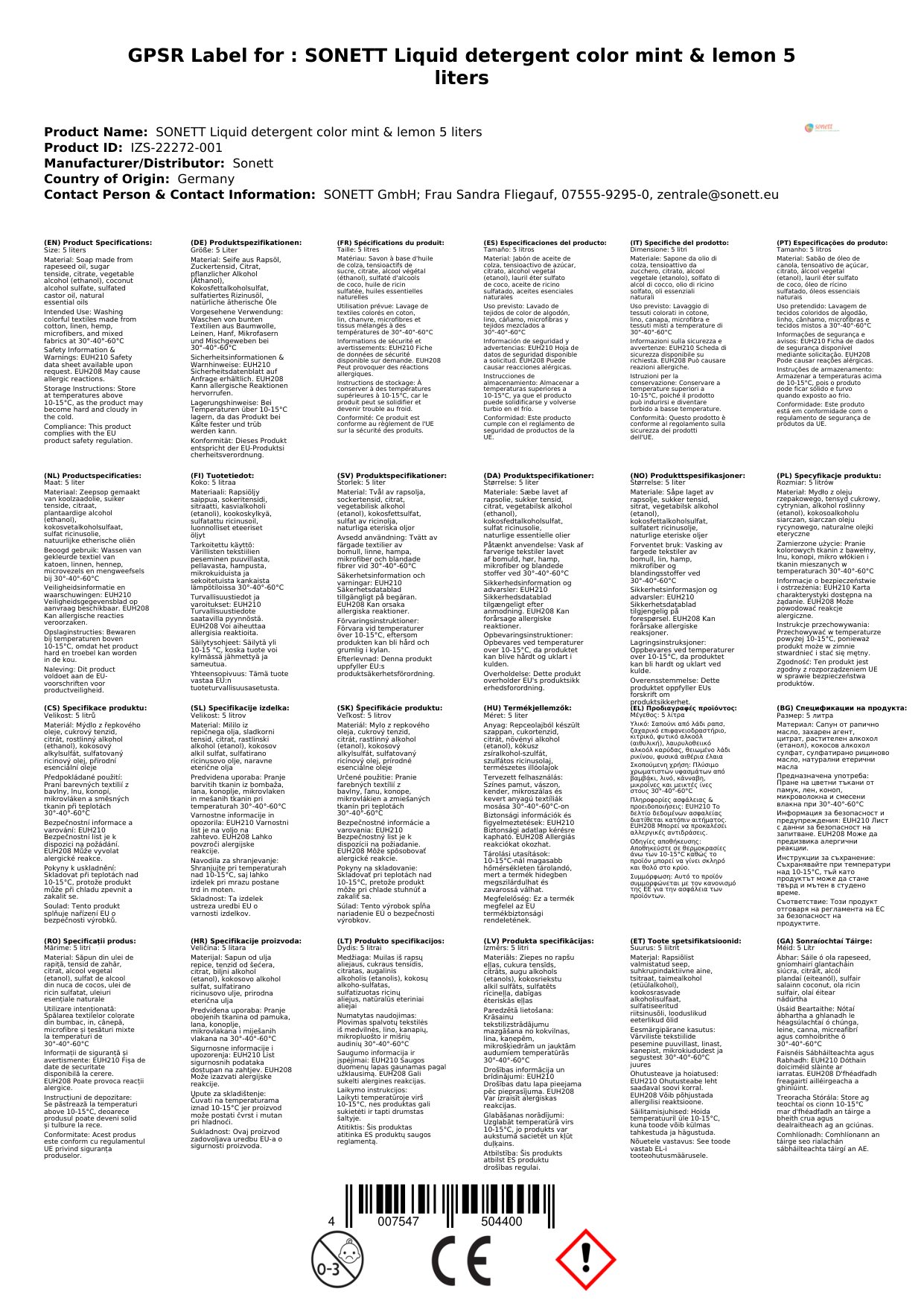 Cuir ceist chun níos mó a fhoghlaim faoin táirgeGlantach dathanna, 5 lítear, boladh mint agus líomóid, glantach leachtach